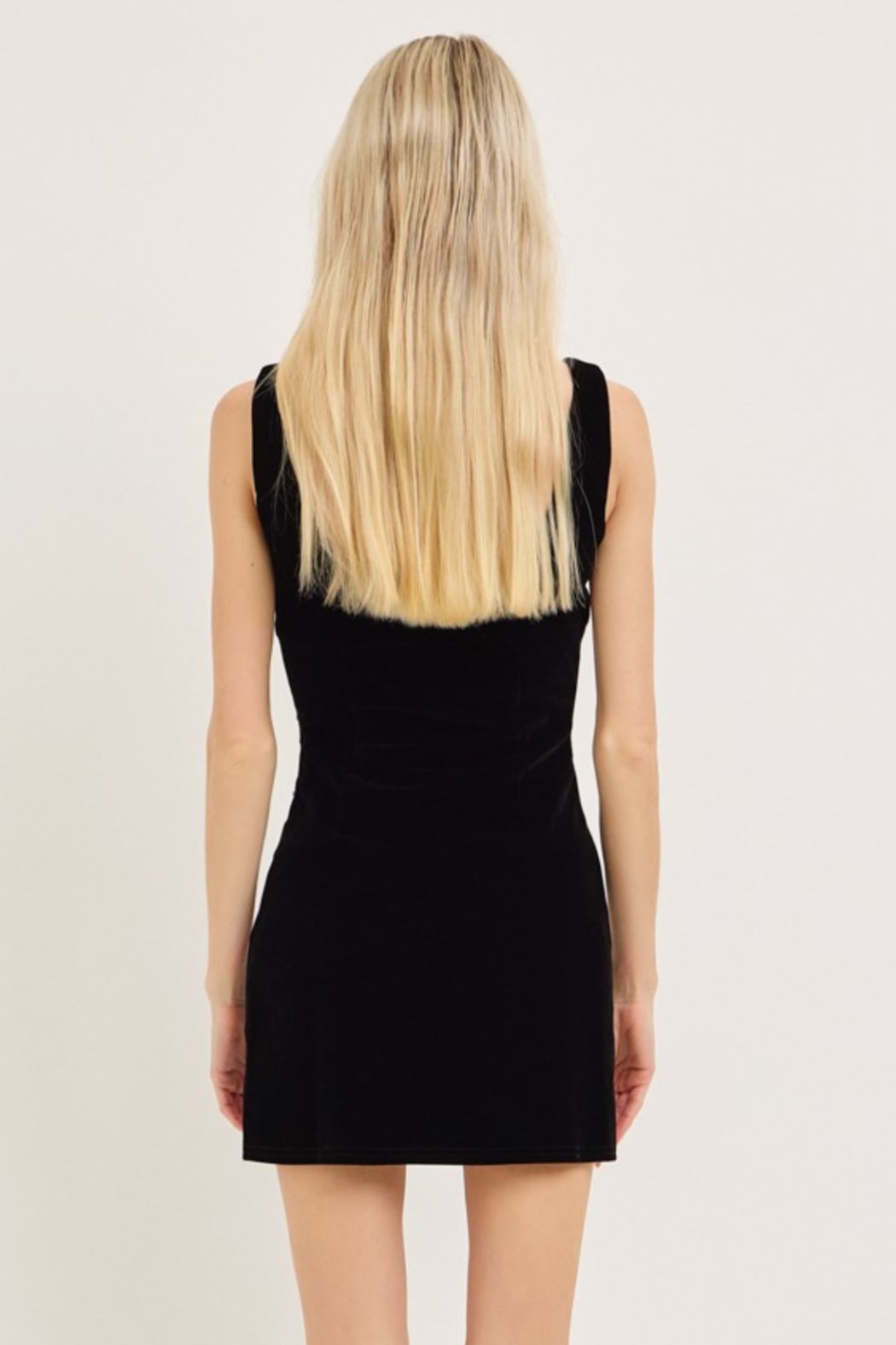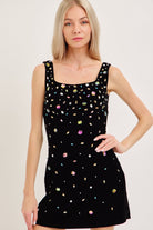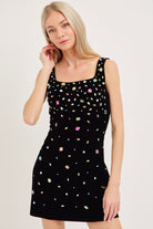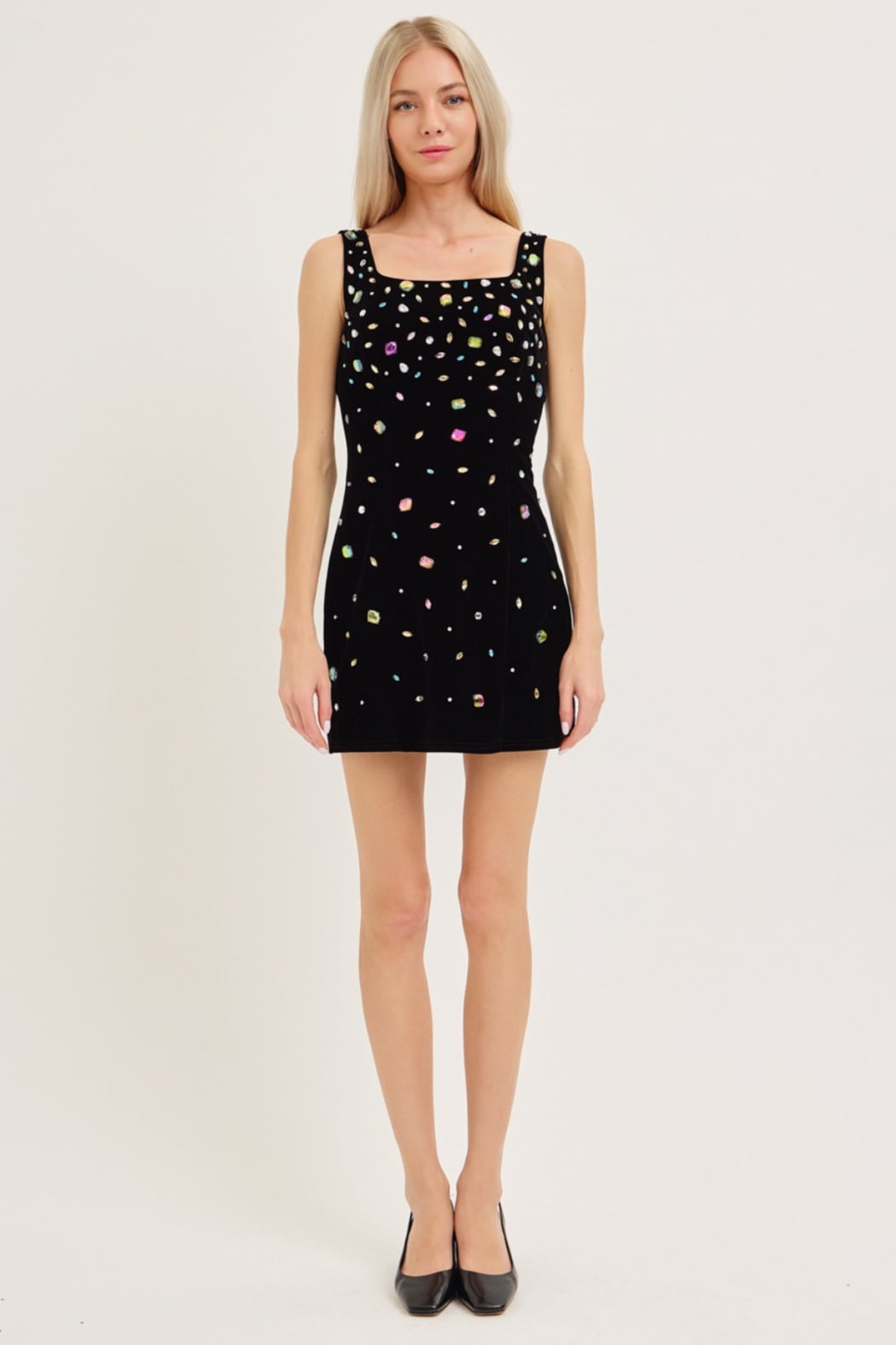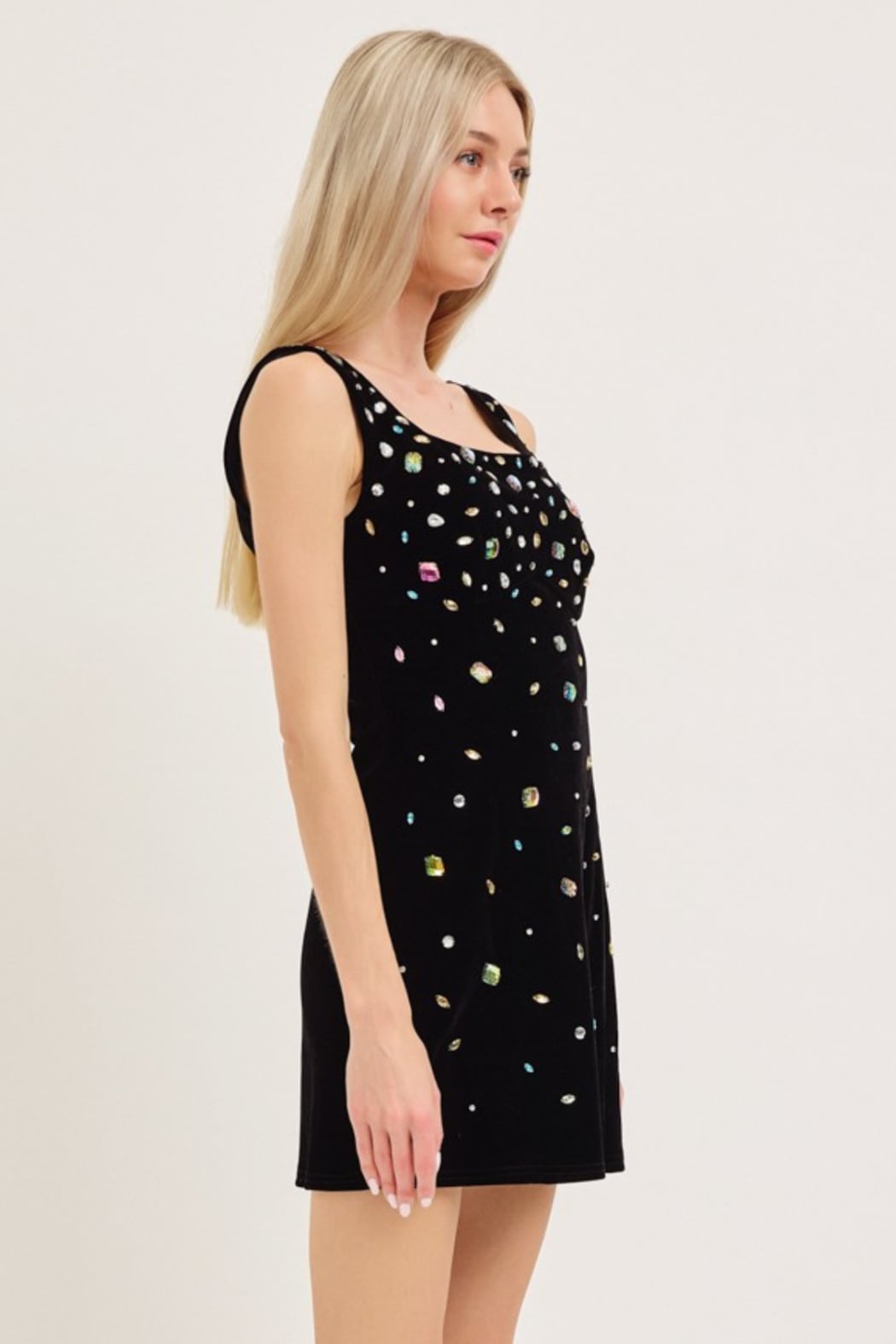 Make an entrance with this eye-catching Velvet Jewel Dress. The soft black velvet is sprinkled with multicolor jeweled studs that catch the light and give the dress that fun, luxe sparkle. The square neckline keeps it clean and flattering, while the mini length brings flirty energy. Perfect for holiday parties, birthday nights out, or girls' dinners. Features: - Square neckline - Sleeveless - Black color Keep it sleek with black heels and a mini clutch, or go playful with metallic accessories to match the gems. Fabric: 100% Polyester Model is wearing a size Small.