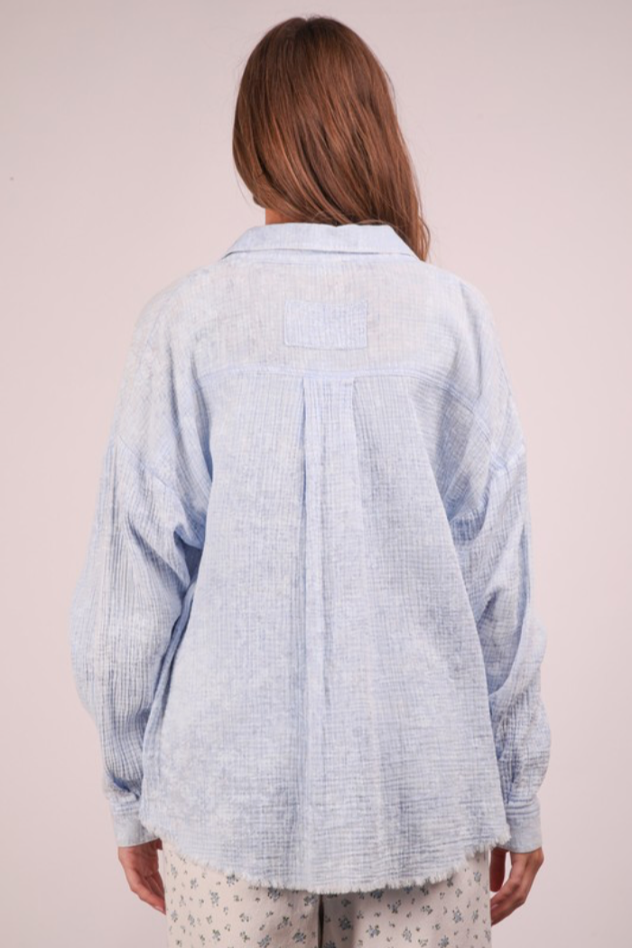 The Washed Textured Button Up is a mineral washed gauze top that features a collar neckline, button up front closure, two front pockets, and a frayed hem.