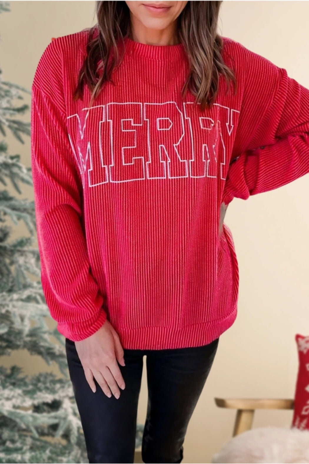 Celebrate the season in cozy, festive style with our Festive Merry Letter Ribbed Top. Featuring bold white “MERRY” lettering on a soft, oversized ribbed fabric, this top is perfect for holiday gatherings, festive outings, or simply spreading Christmas cheer at home. Its relaxed fit and stretchy material make it comfortable while keeping you stylish all season long. 🎄✨