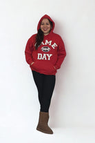 Cheer in style with the Game Day Sparkle Hoodie. Soft and cozy with a 50/50 cotton-poly blend, it features long sleeves, a hood, and bold “GAME DAY” chenille lettering surrounding a sparkling football sequin patch. True-to-size and perfect for layering, this festive hoodie is ideal for tailgates, watch parties, or casual everyday wear — bringing cozy comfort and fan-worthy style to every game day.