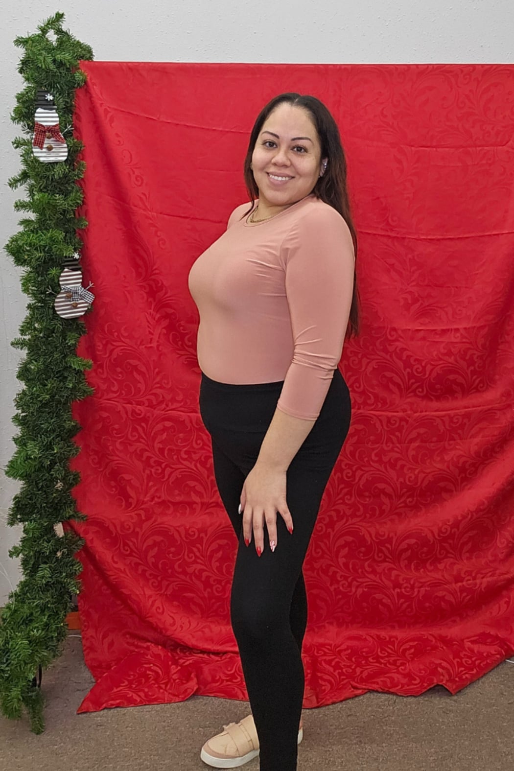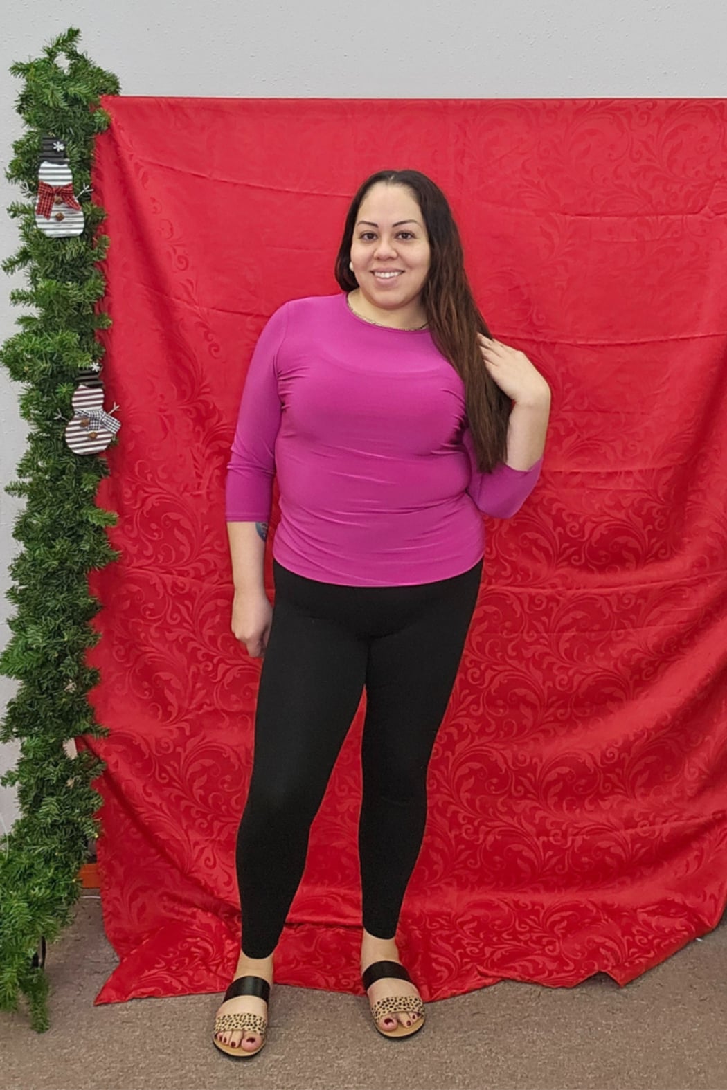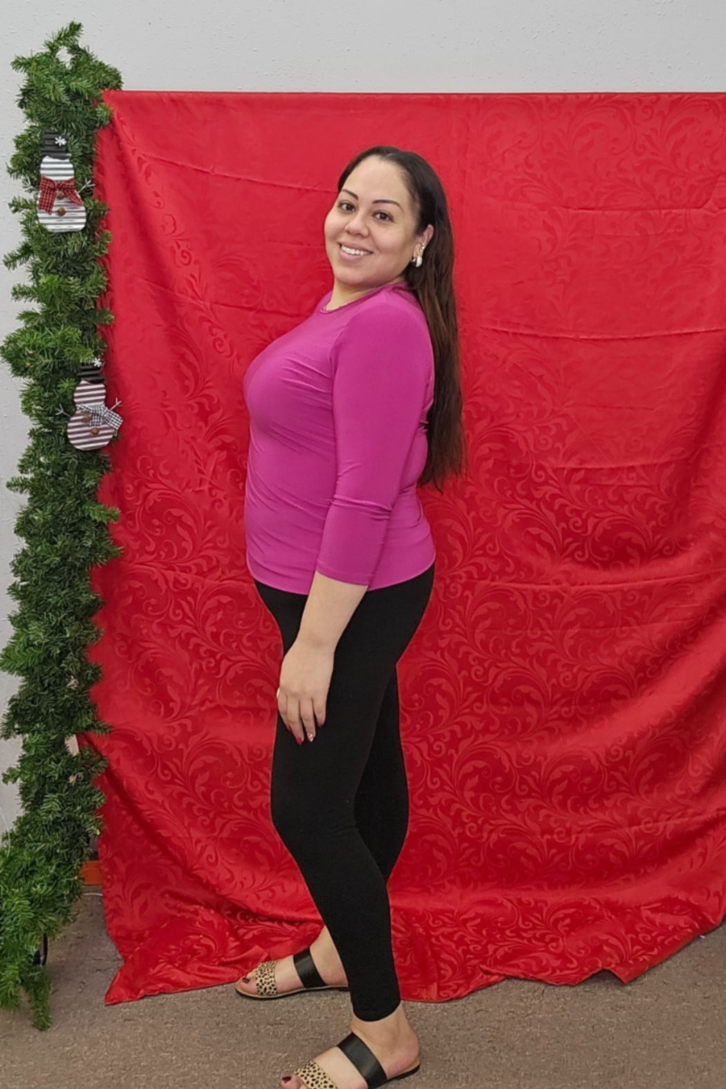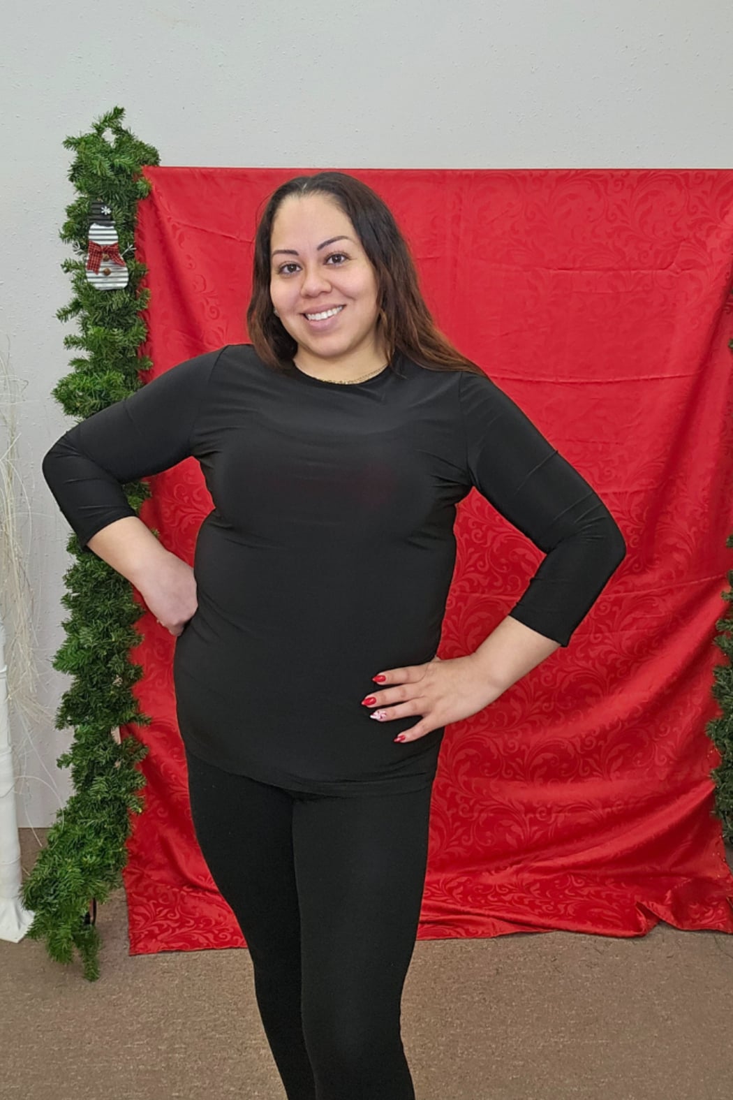 Stay polished and effortless with this wrinkle-free 3/4 sleeve layering top from Deja Vu Boutique in Ripon, WI. Made from a soft, stretchy blend, it offers a smooth, flattering fit that's perfect for work, travel, or everyday wear. True to size with a classic round neckline, it pairs seamlessly under cardigans, jackets, and vests for year-round style.