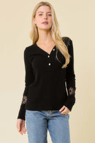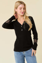 Black V-Neck Lace Trim Knit Top | Button Detail Long Sleeve | Nadya’s Closet