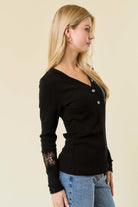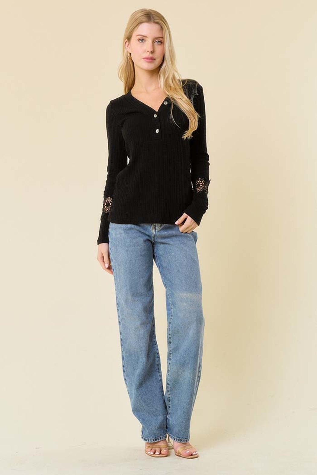 Elegant black ribbed knit top with a flattering V-neckline, button detailing, and feminine lace-trim sleeves. Soft, stretchy, and perfect for everyday chic style.