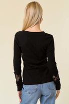 black knit top, lace trim sleeves, v-neck long sleeve, button detail knit shirt, feminine knitwear, casual chic top, stretchy ribbed top, fall layering top, everyday essential top, boutique women’s clothing