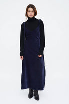 Long dress in navy blue velvet fabric. Featuring a V-neckline and lace-up straps and side slits. The style features slight texture on fabric.