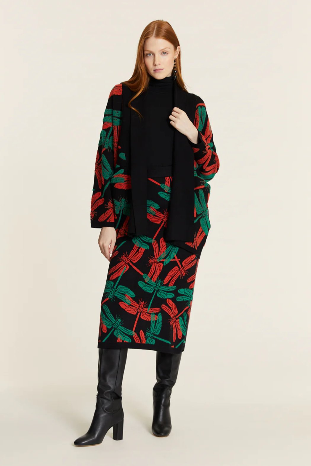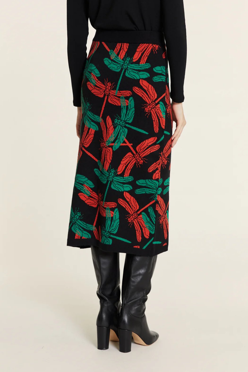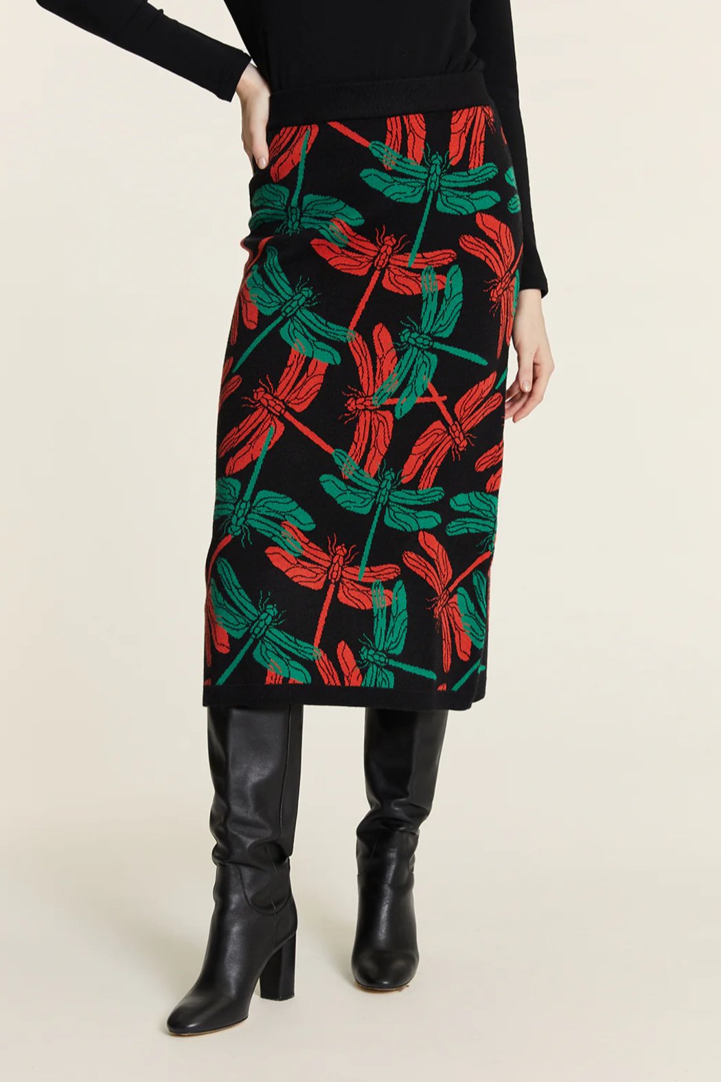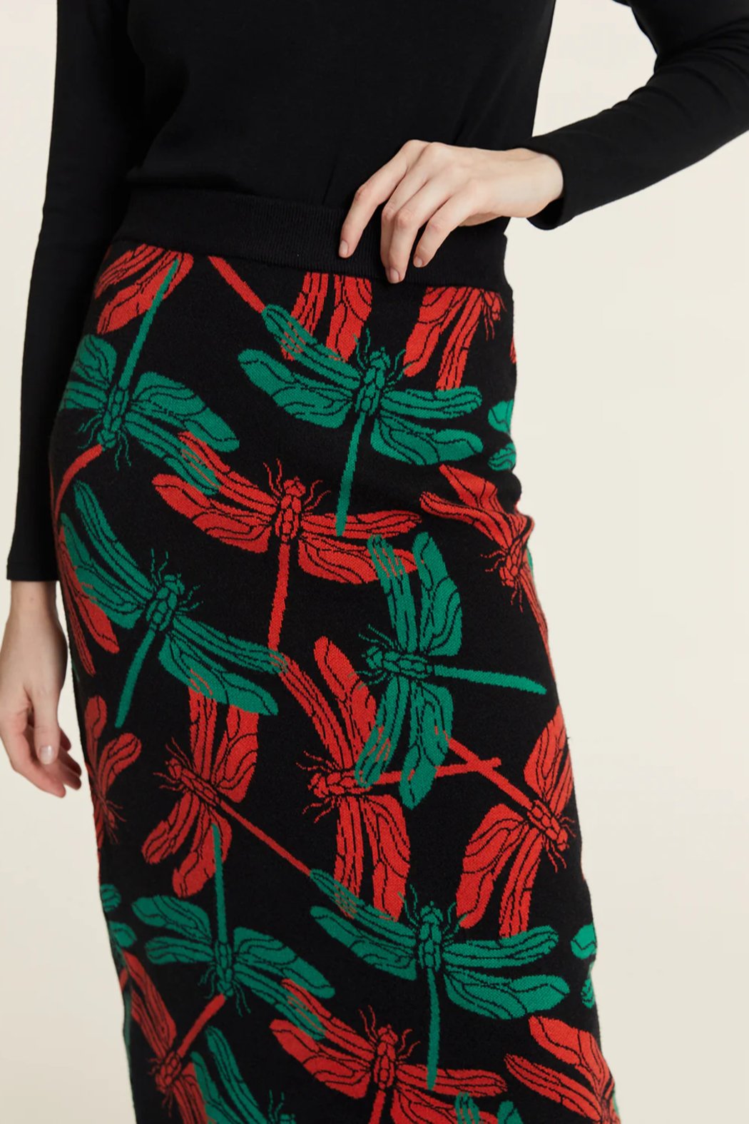 Dragonfly knit skirt, below-the-knee hobble skirt, elastic waistband.