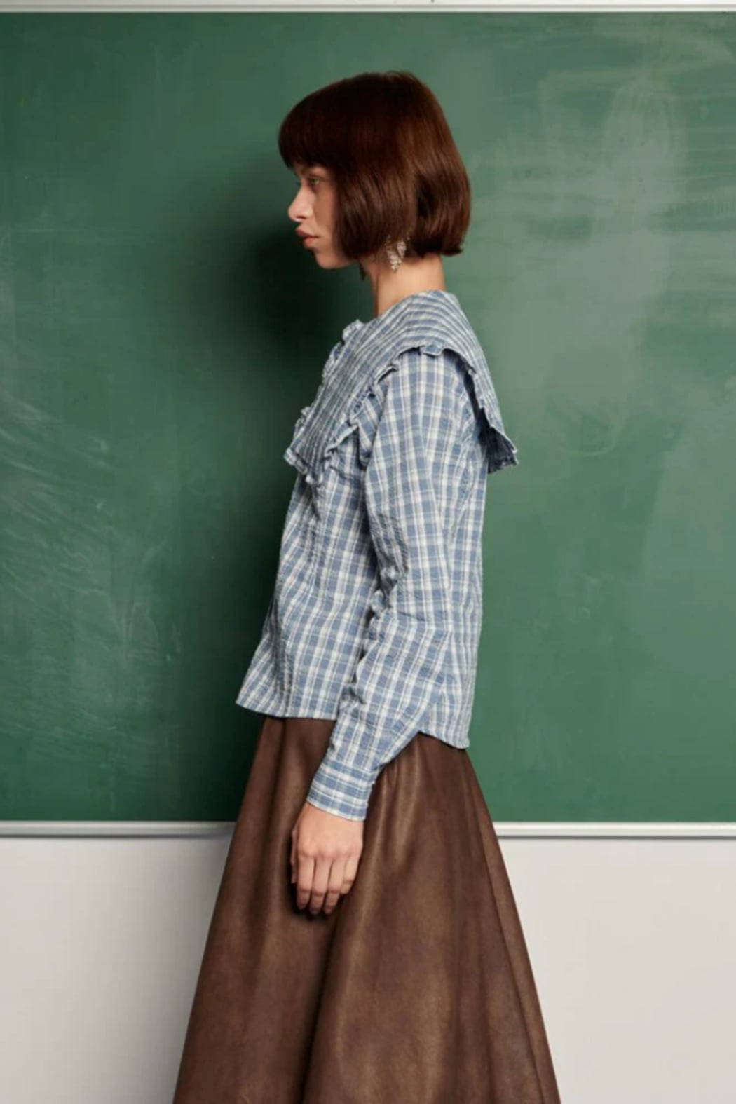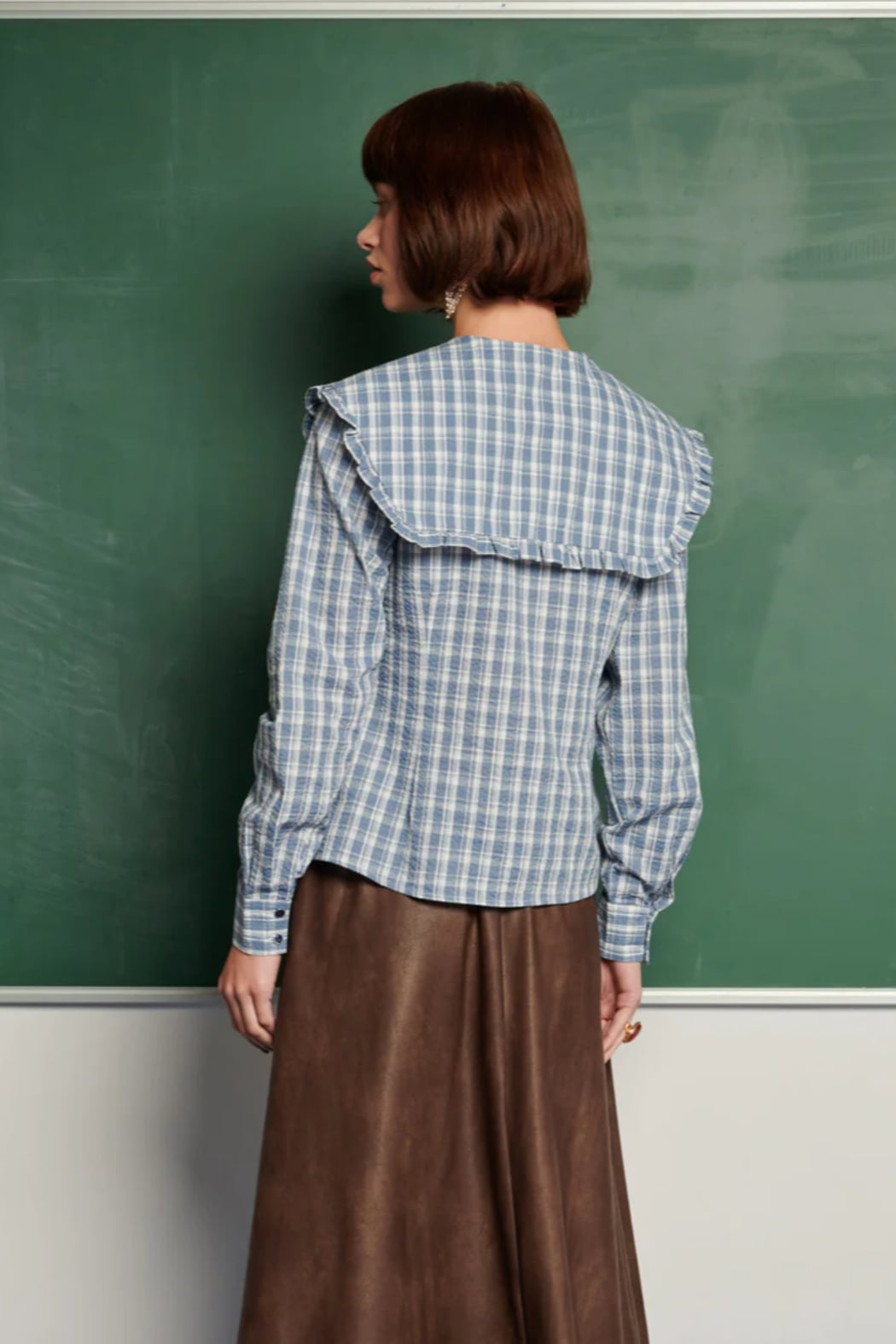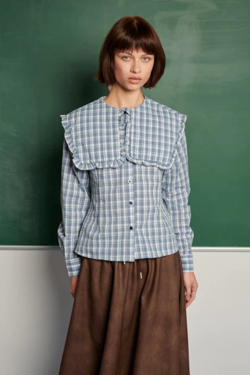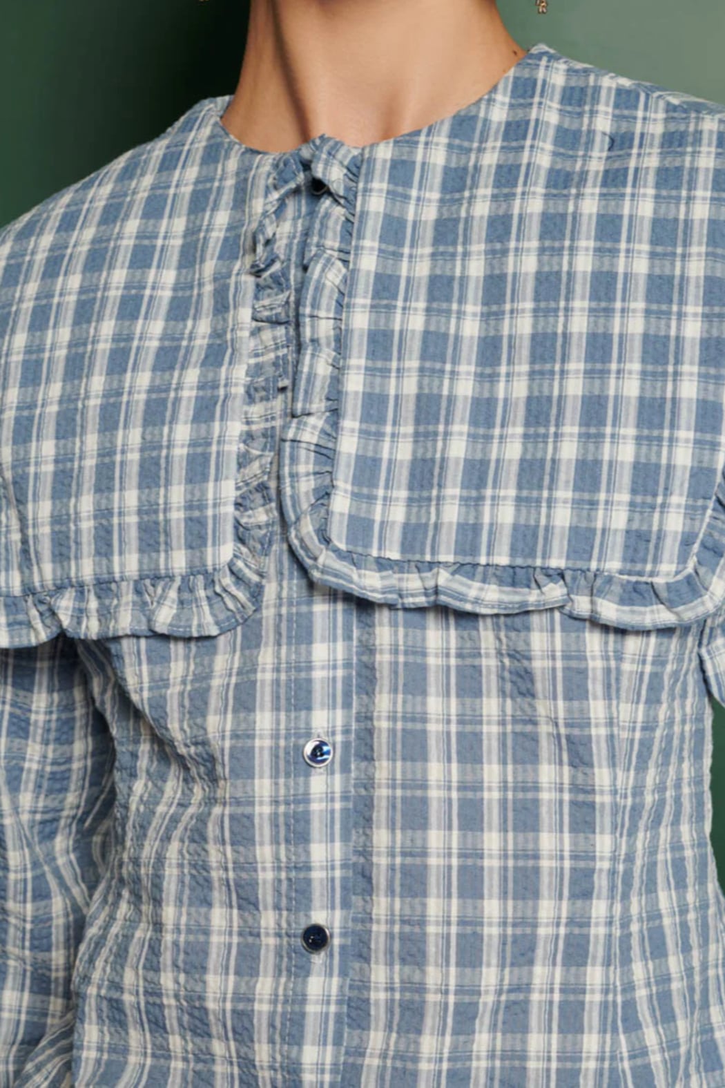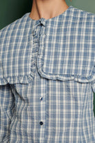 The Ersa Check Blouse is a checked button-front top with an oversized ruffle-trim collar and a slightly fitted waist for a feminine silhouette. It features long sleeves and a small tie at the neckline that gives the blouse a polished, vintage-inspired feel. The lightweight woven fabric reads casual yet refined and layers beautifully under jackets or with skirts. This piece is by Ghospell and balances whimsical details with wearable everyday styling. Shirt in a seersucker check fabric.