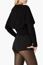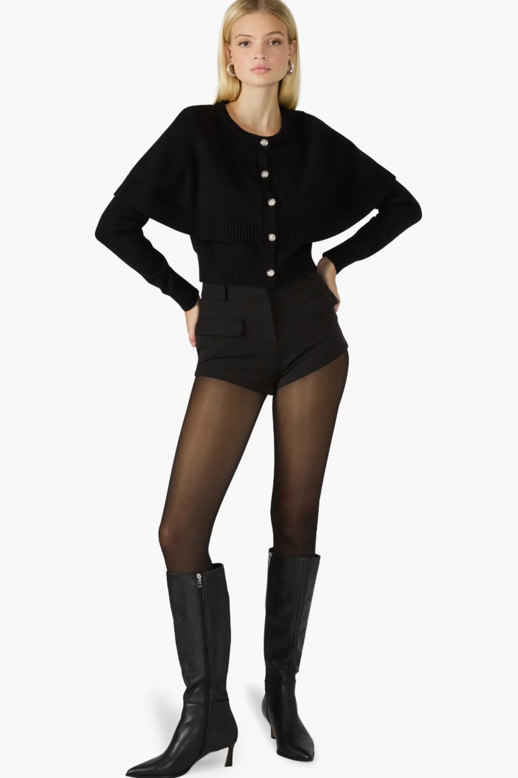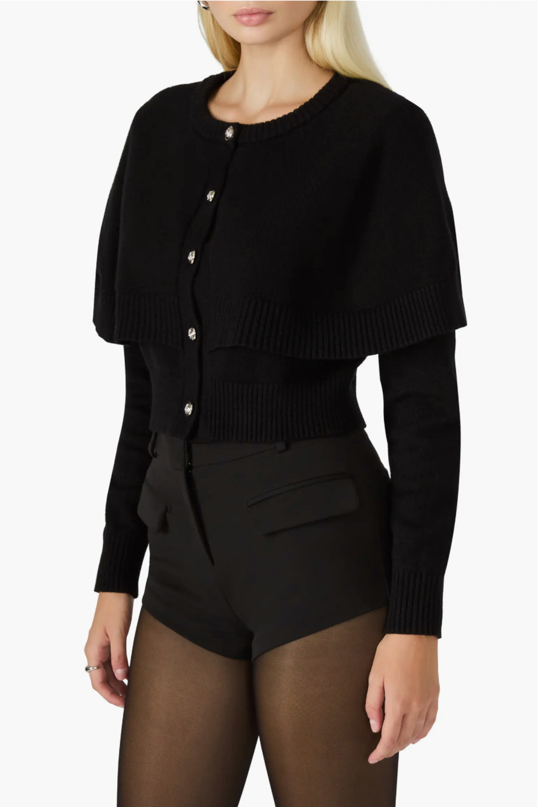 A cape detail dials up the drama for a cozy cardi closed with crested buttons.