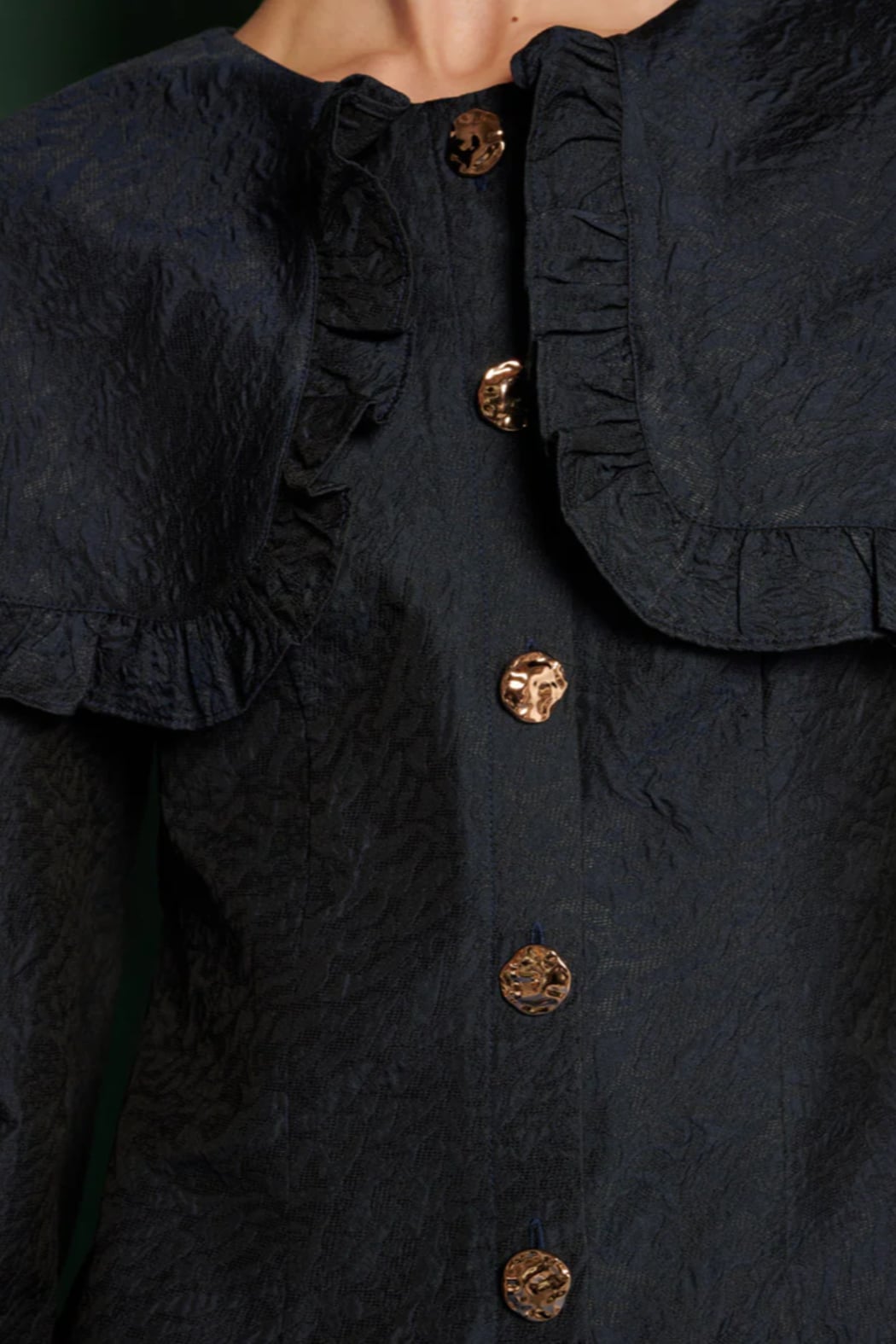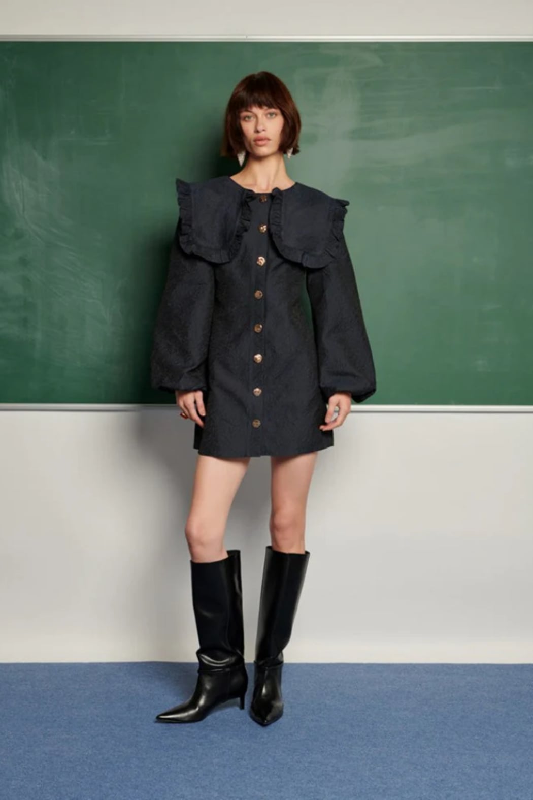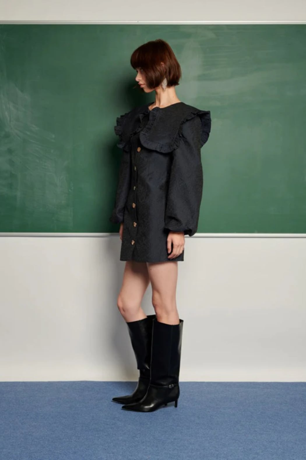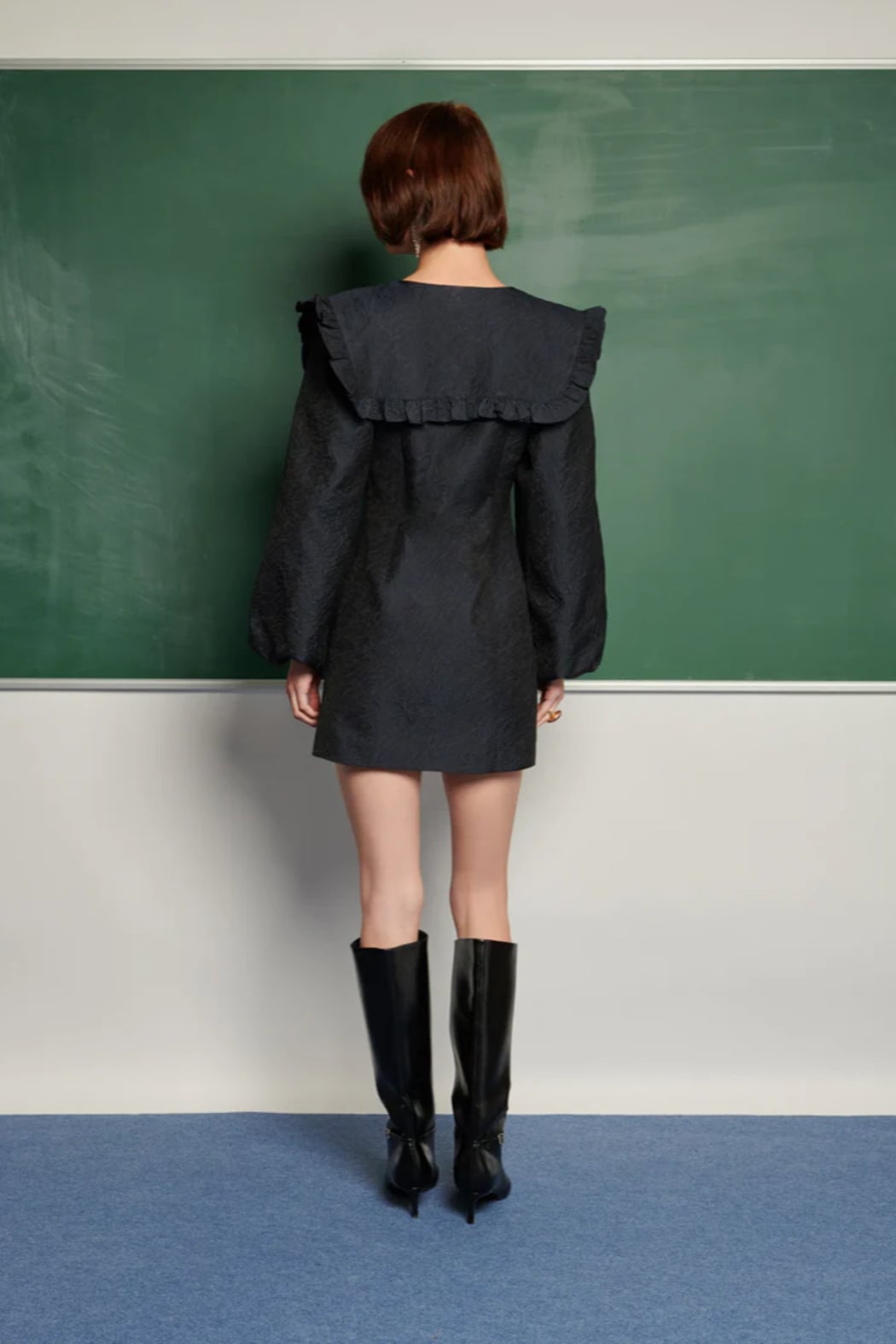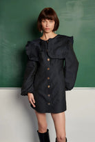 A sculpted mini with a bold oversized ruffle collar and button-front closure, the Inola Mini Dress balances playful detailing with a streamlined silhouette. The long puff sleeves and textured fabric give the piece a fashion-forward, editorial feel. Ghospell designed this mini for cocktail hours and night out occasions where a trendy, statement look is desired.