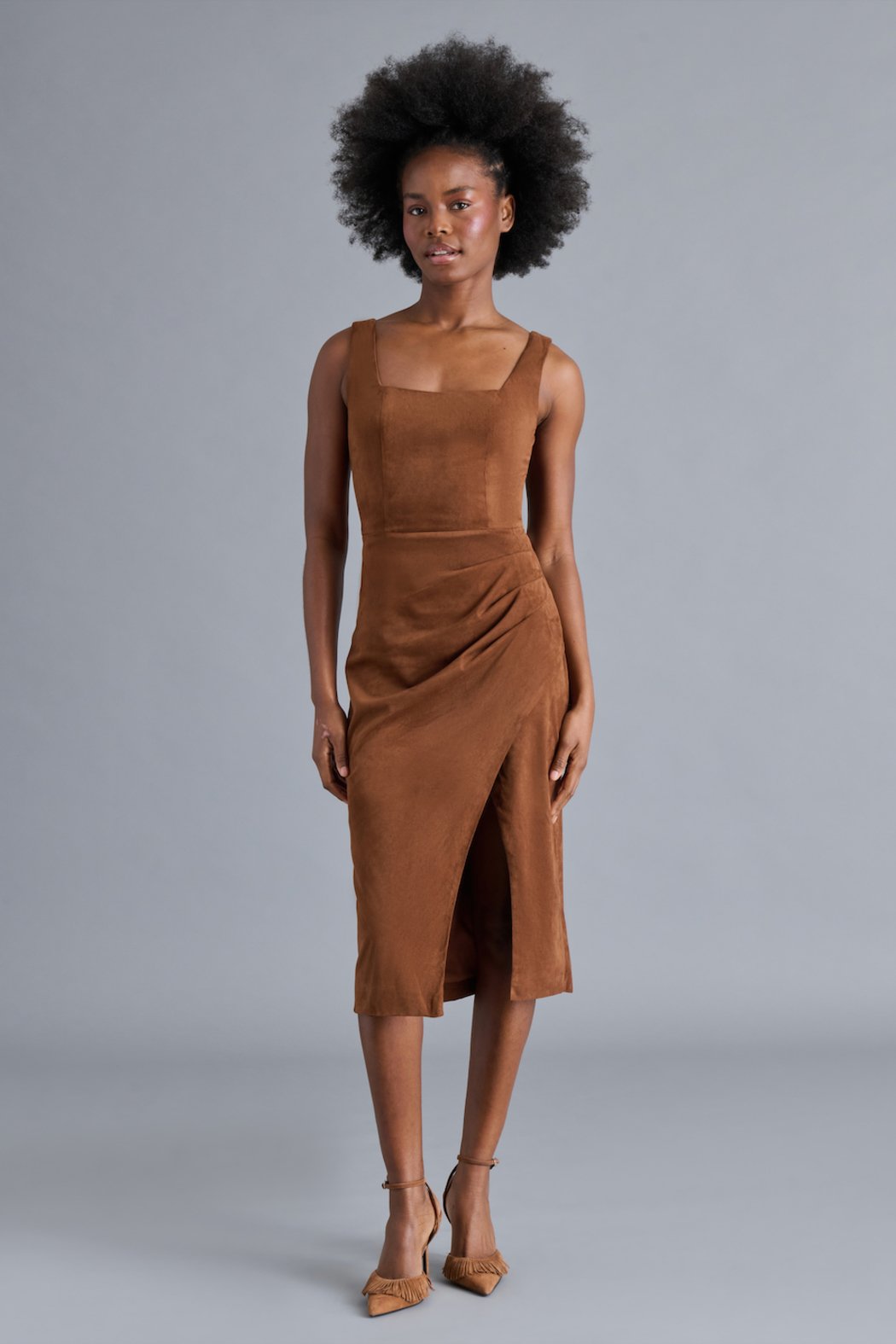 Faux suede fabric, pleated gather at one hip, slit at side skirt