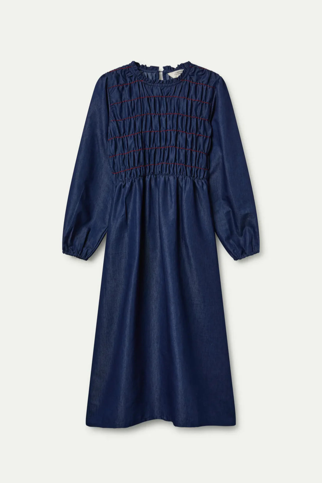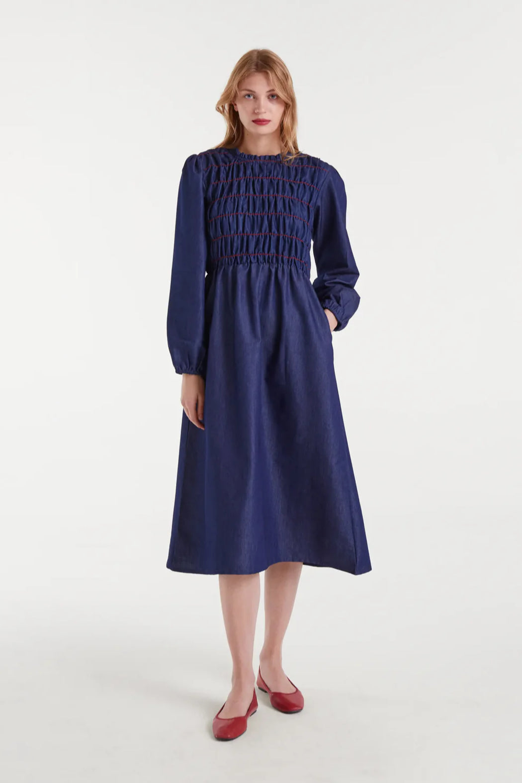 Midi dress in 100% cotton chambray fabric in blue. Featuring a round neckline and long sleeves with elastic cuffs. Side pockets. Front and back smocking with contrast stitching.