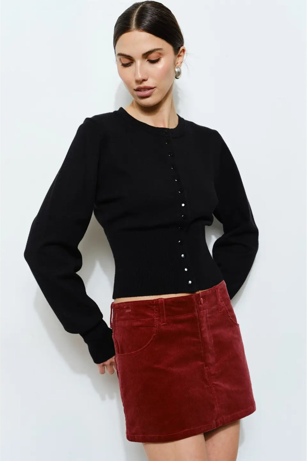 A sophisticated take on a classic silhouette, this cardigan features a fitted, body-skimming shape. A full snap button-down front and fitted bodice make it a perfect stand-alone top or versatile layering piece.