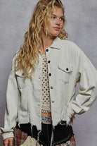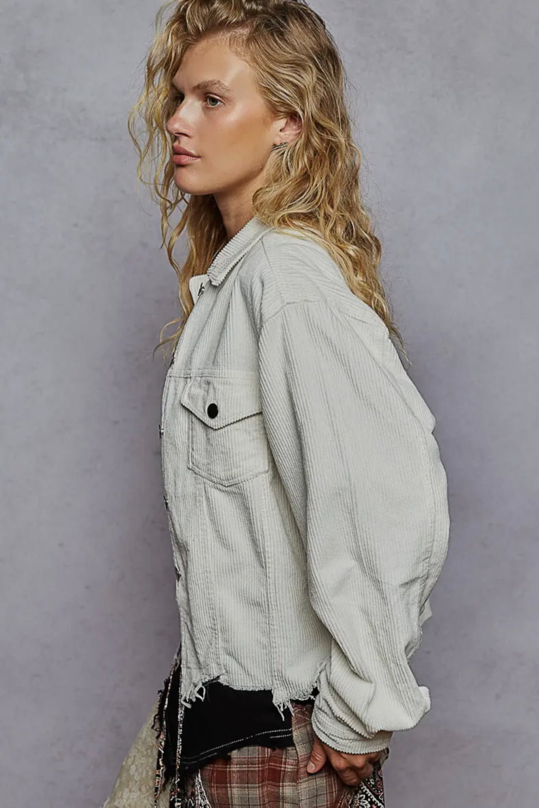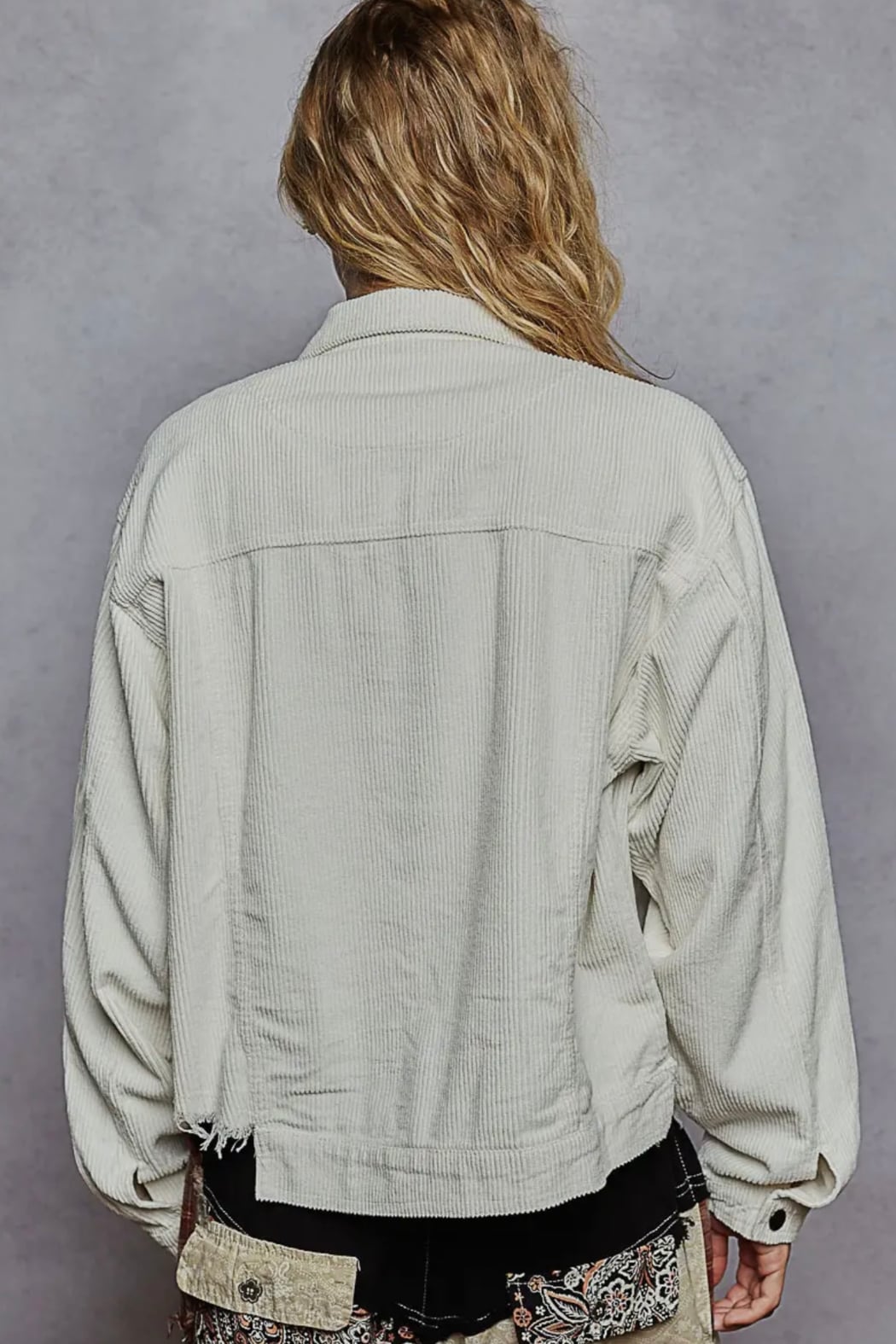 RELAXED FIT CORDUROY RAW HEM TRUCKER JACKET WITH DUAL CHEST POCKETS AND ADJUSTABLE CUFFS