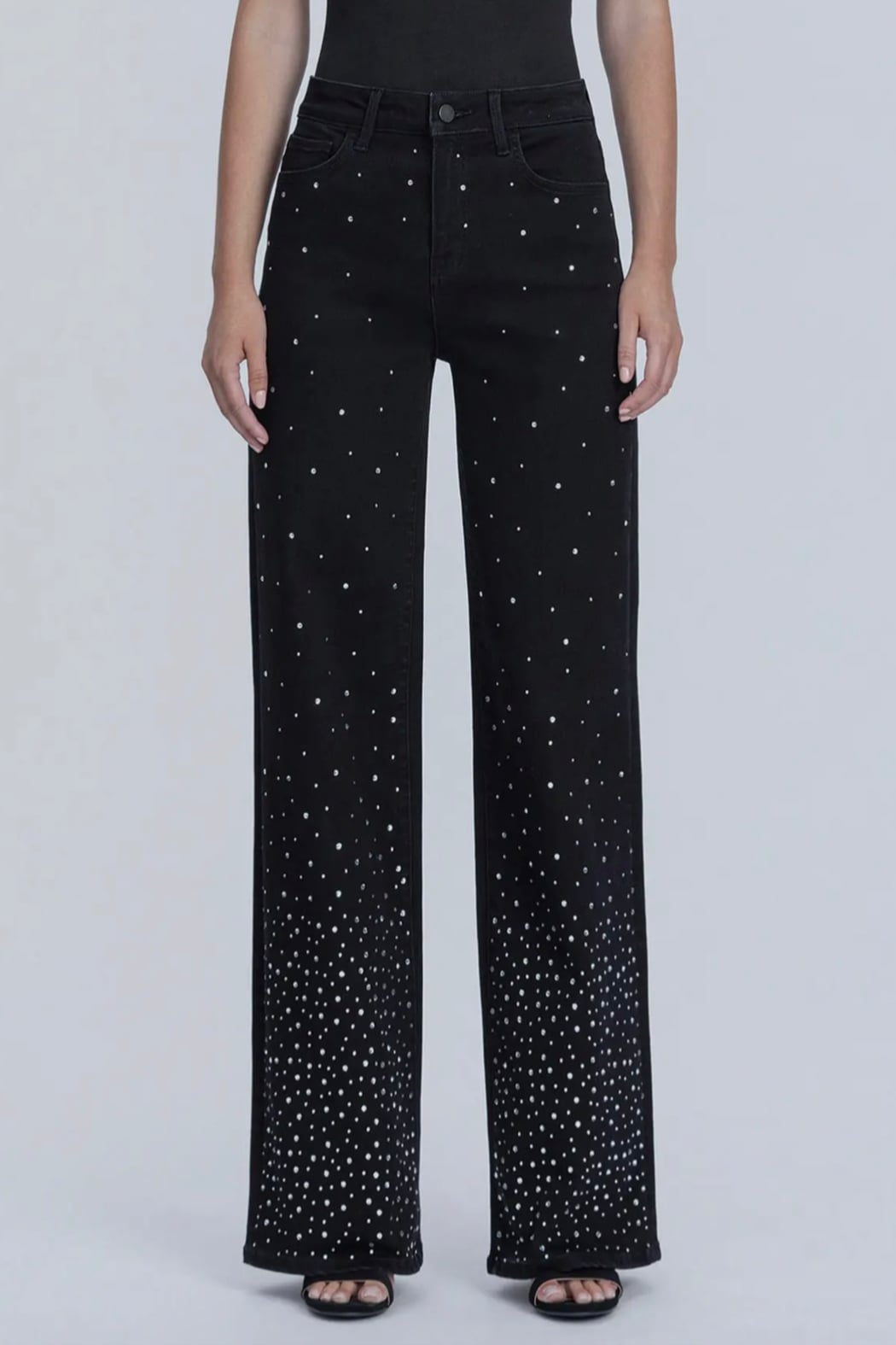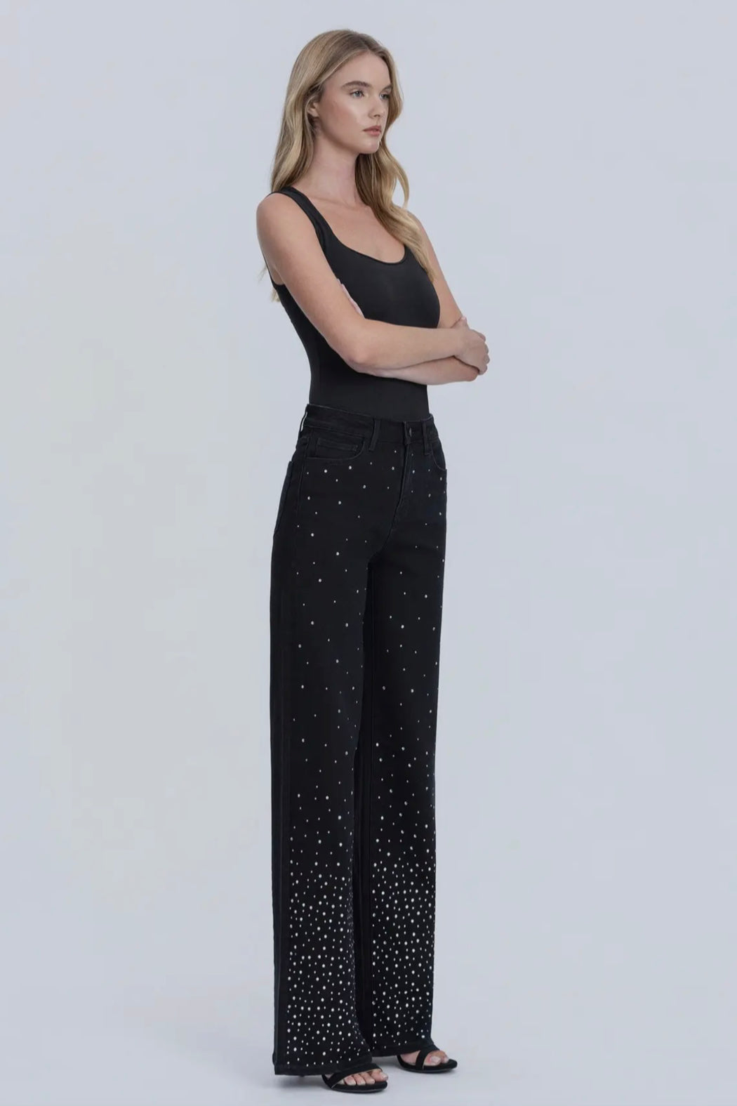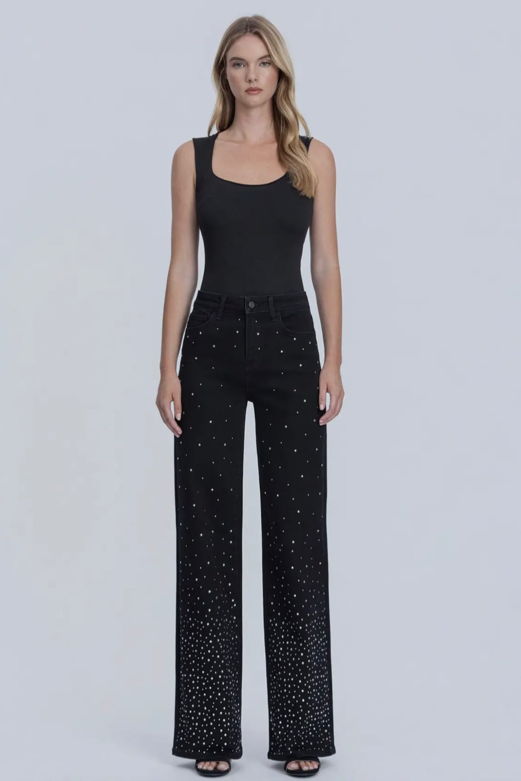 HIGH-RISE RHINESTONE EMBELLISHED WIDE LEG JEANS WITH FRONT AND BACK POCKETS FABRIC: 70% COTTON 22% POLYESTER 7% VISCOSE 1% SPANDEX FIT IS TRUE TO SIZE MADE IN CHINA
