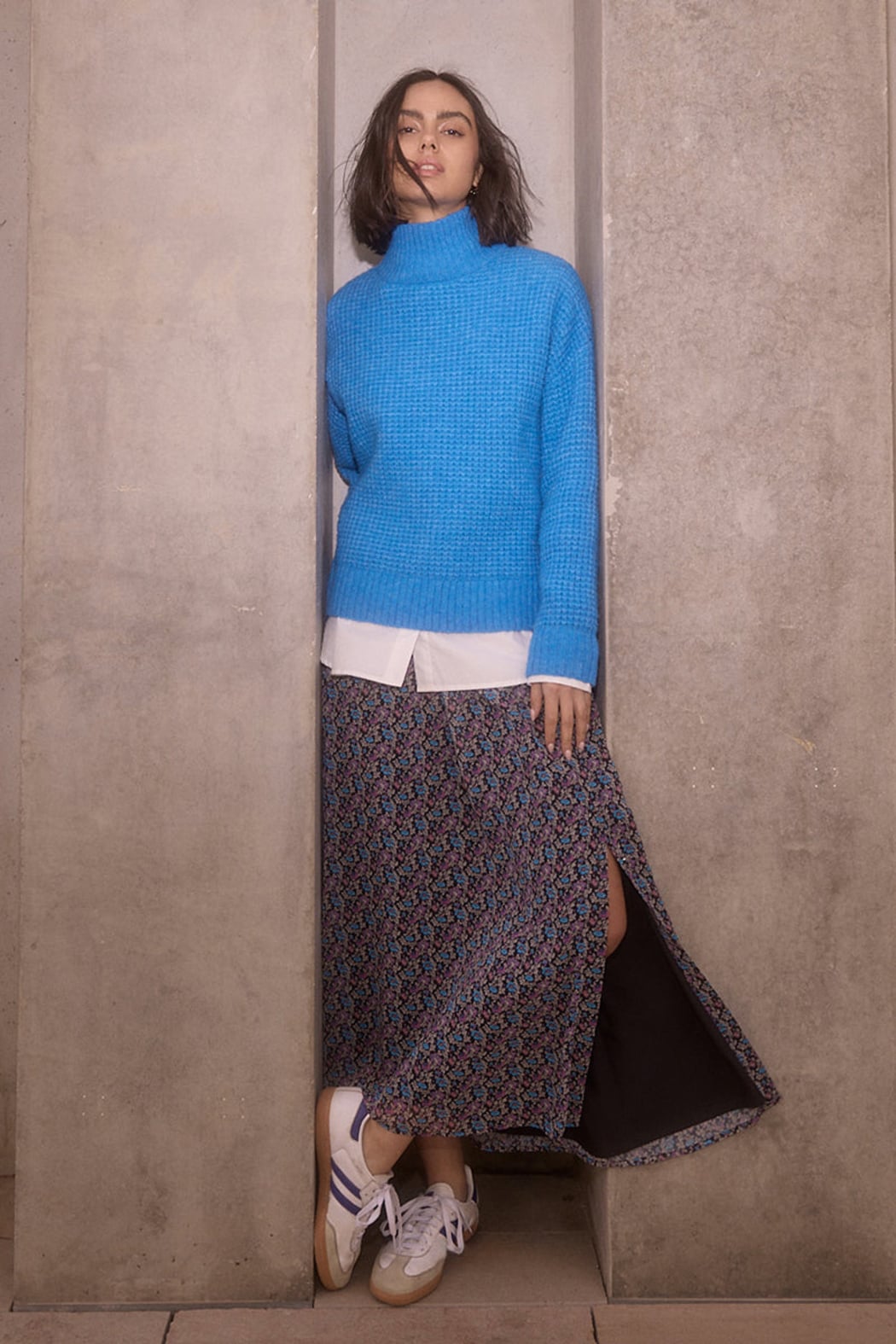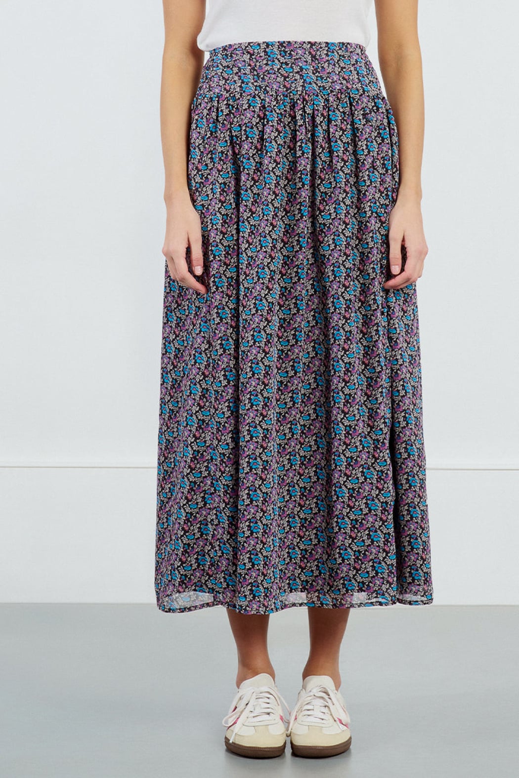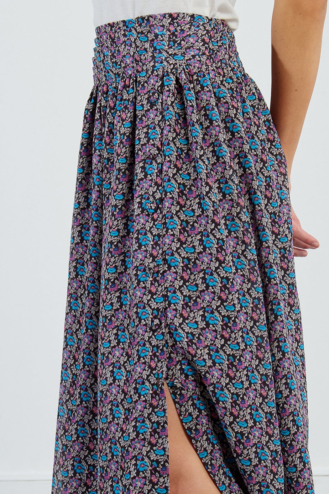 PLEATED MIDI SKIRT WITH RUCHED WAISTBAND AND SIDE SLIT AND MATCHING BUTTONS