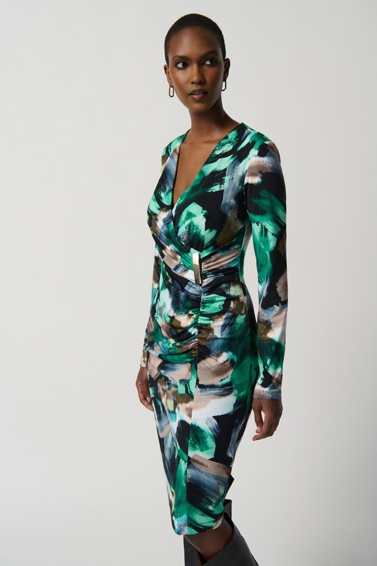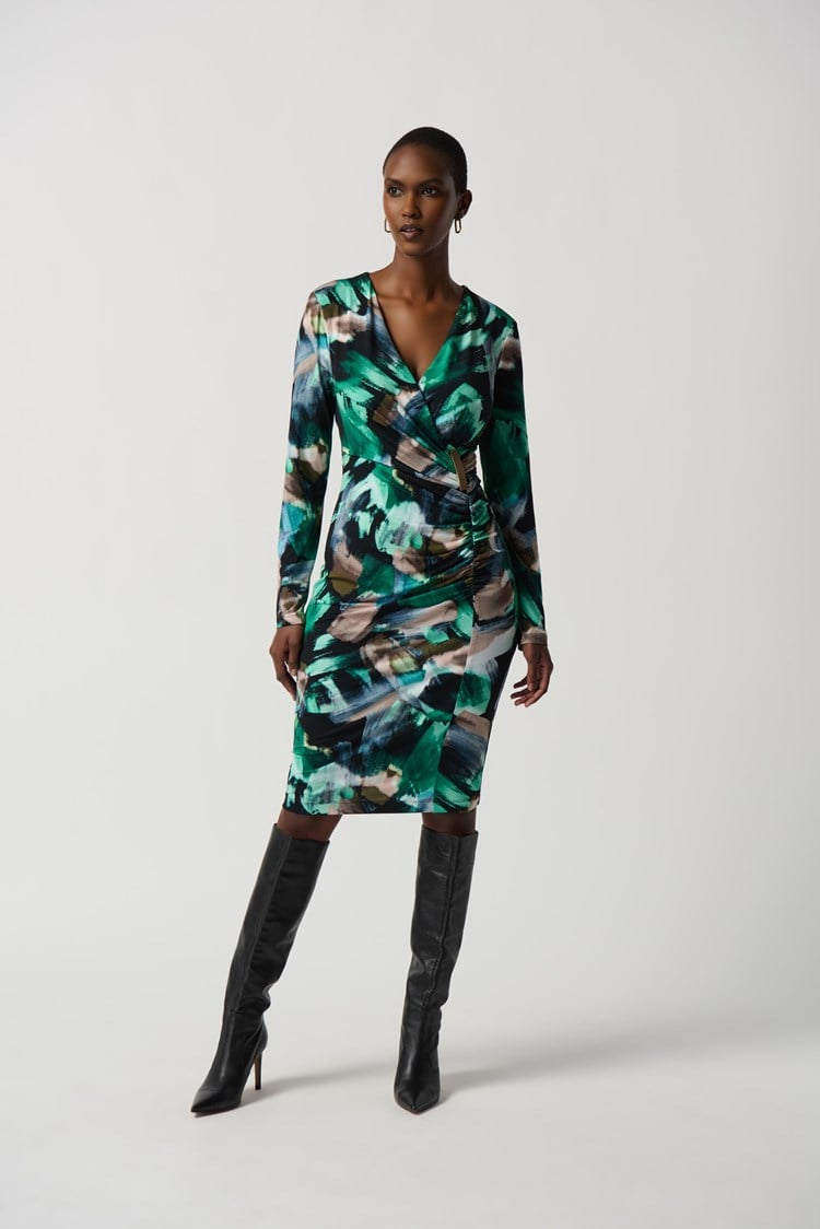 Balancing a modern wrap silhouette with a colourful abstract print, this elegant dress delivers a youthful and feminine flair. Falling just below the knee, it features shirring at the front and is adorned with a lovely ornament.