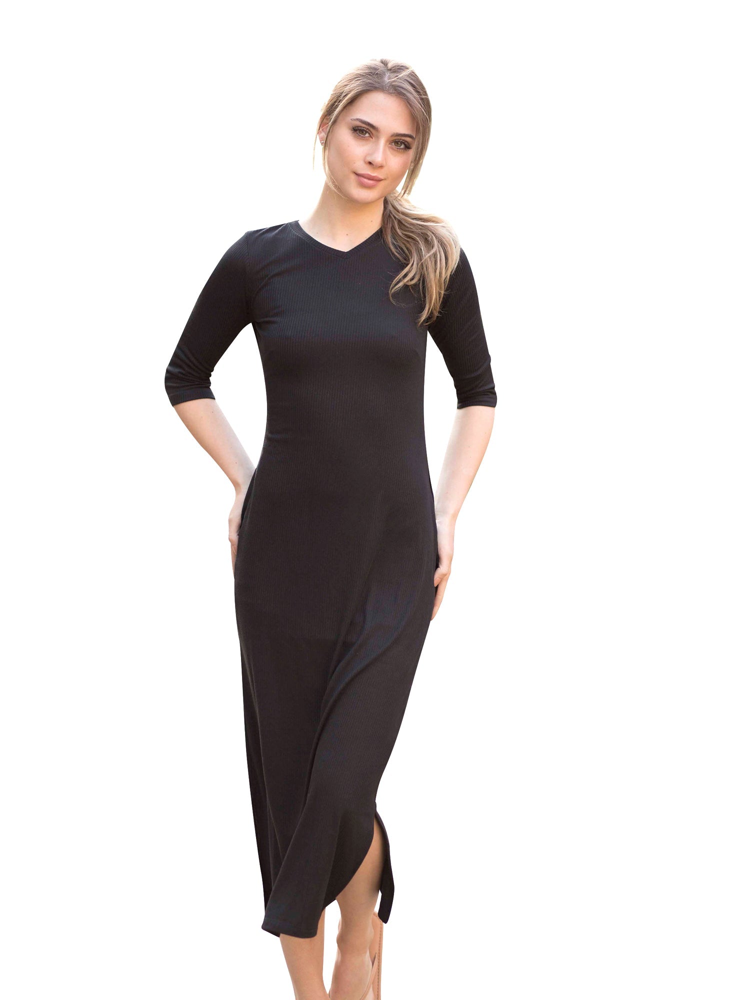 Ribbed 3/4 sleeve straight midi dress with high v-neck and side slits