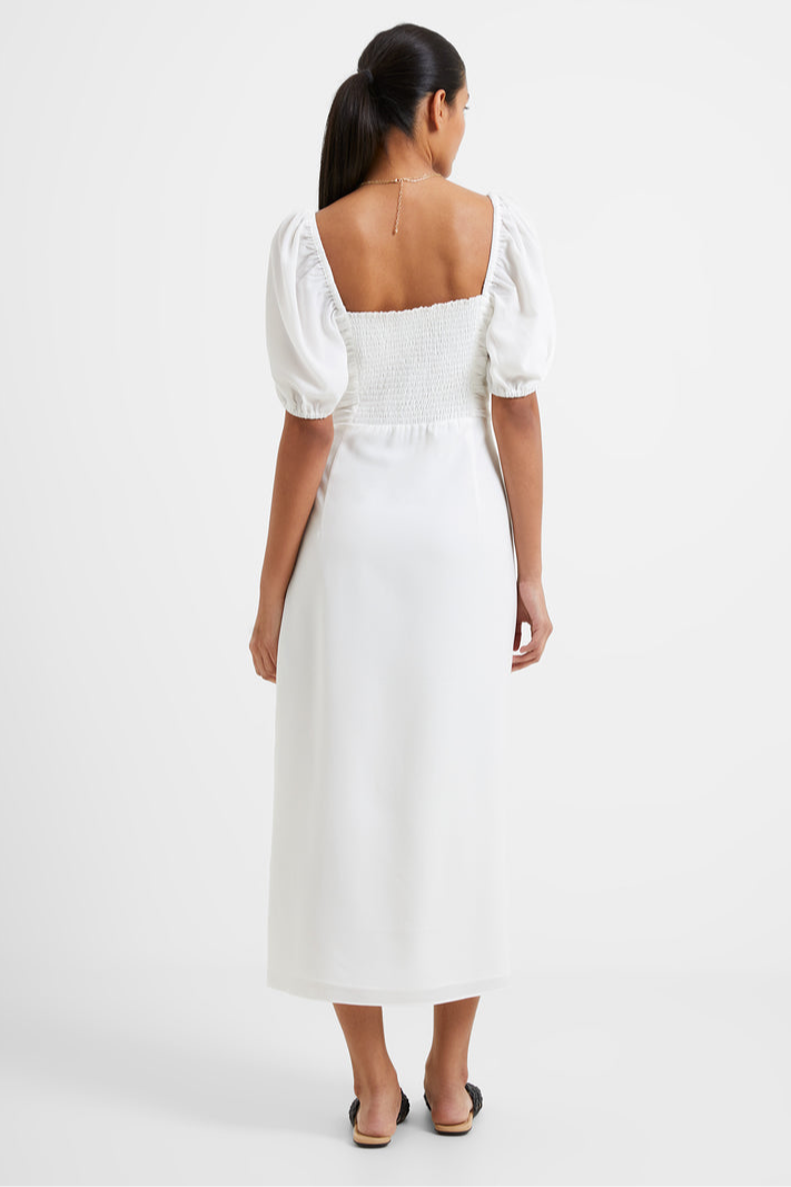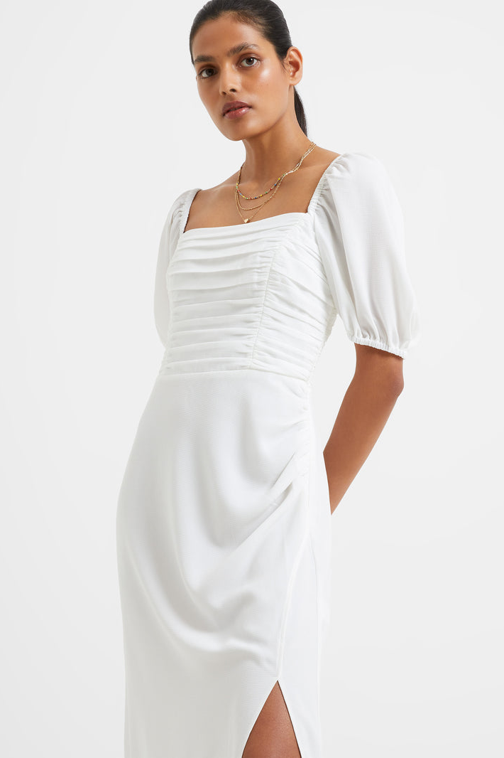 The Afina Verona Ruched Midi Dress is the spring dress of our dreams. Featuring a ruched bodice and gathered waist, with short puff sleeves and a playful leg split. A flattering dress to fall head-over-heels for.