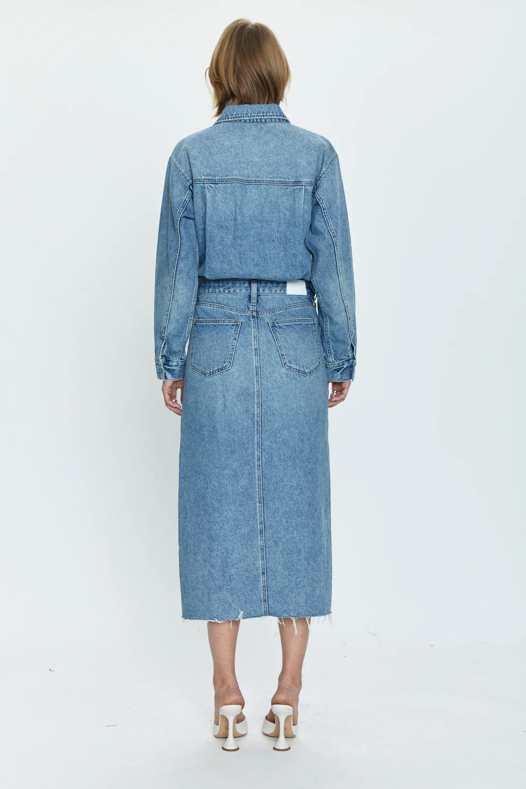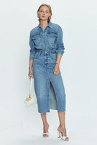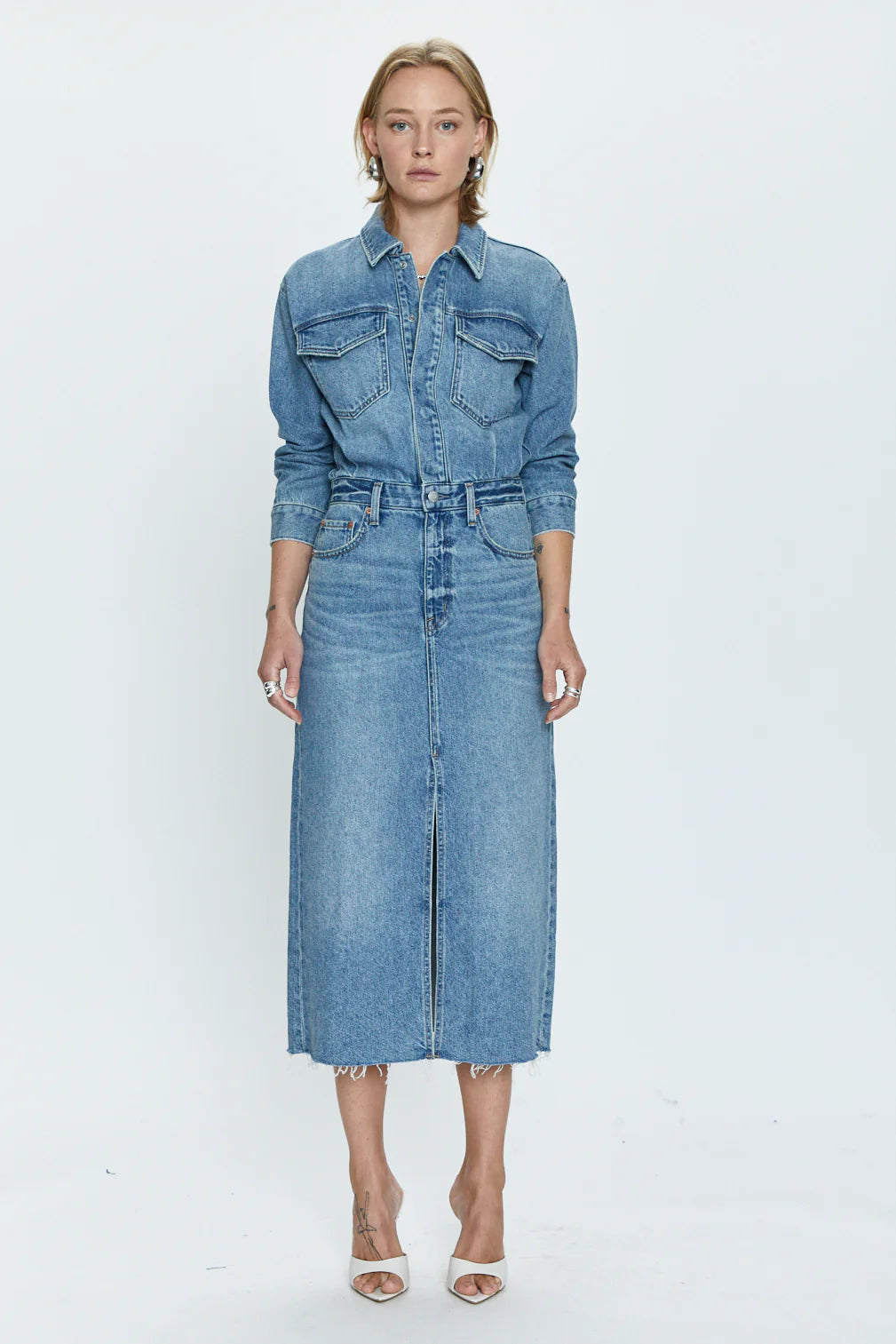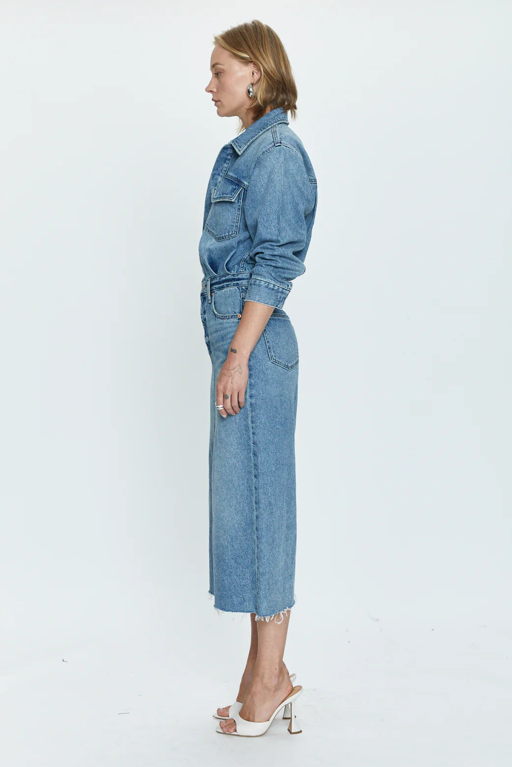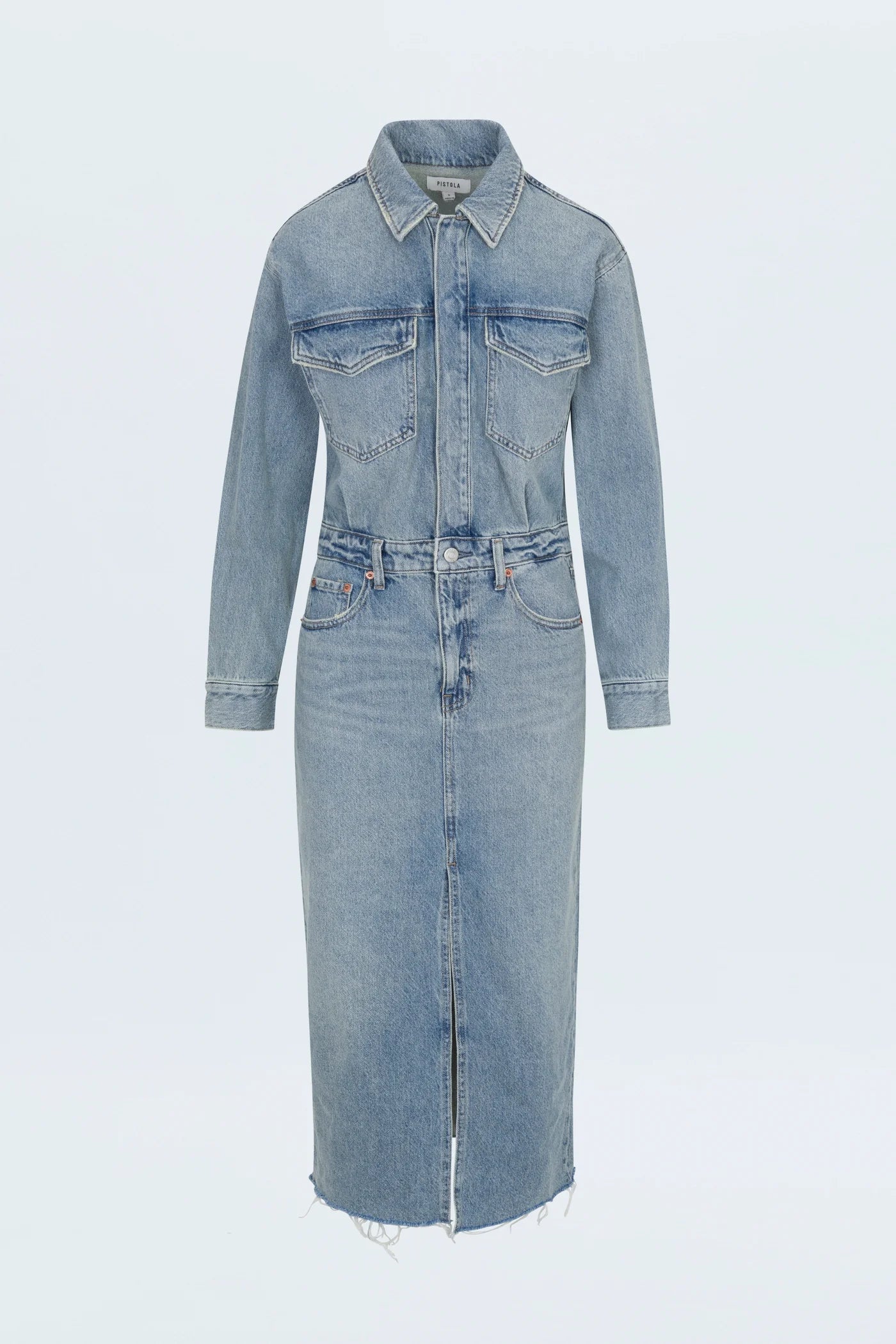 A one-and-done denim dress with a long sleeve top that flows into a midi length skirt. From a button down front hidden with a placket, to the middle slit on the legs for freedom of movement, this was designed with the intention of effortless wear.