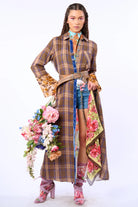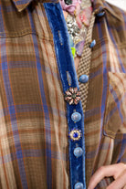 This playful plaid duster features a surprising twist with a floral and peacock print on the back and floral burnout velvet on the lower sleeves. It includes handy front and side pockets, a velvet center front placket, and two sparkling crystal buttons that add a touch of charm. The warm brown plaid combo makes it a fun and stylish choice for any day.