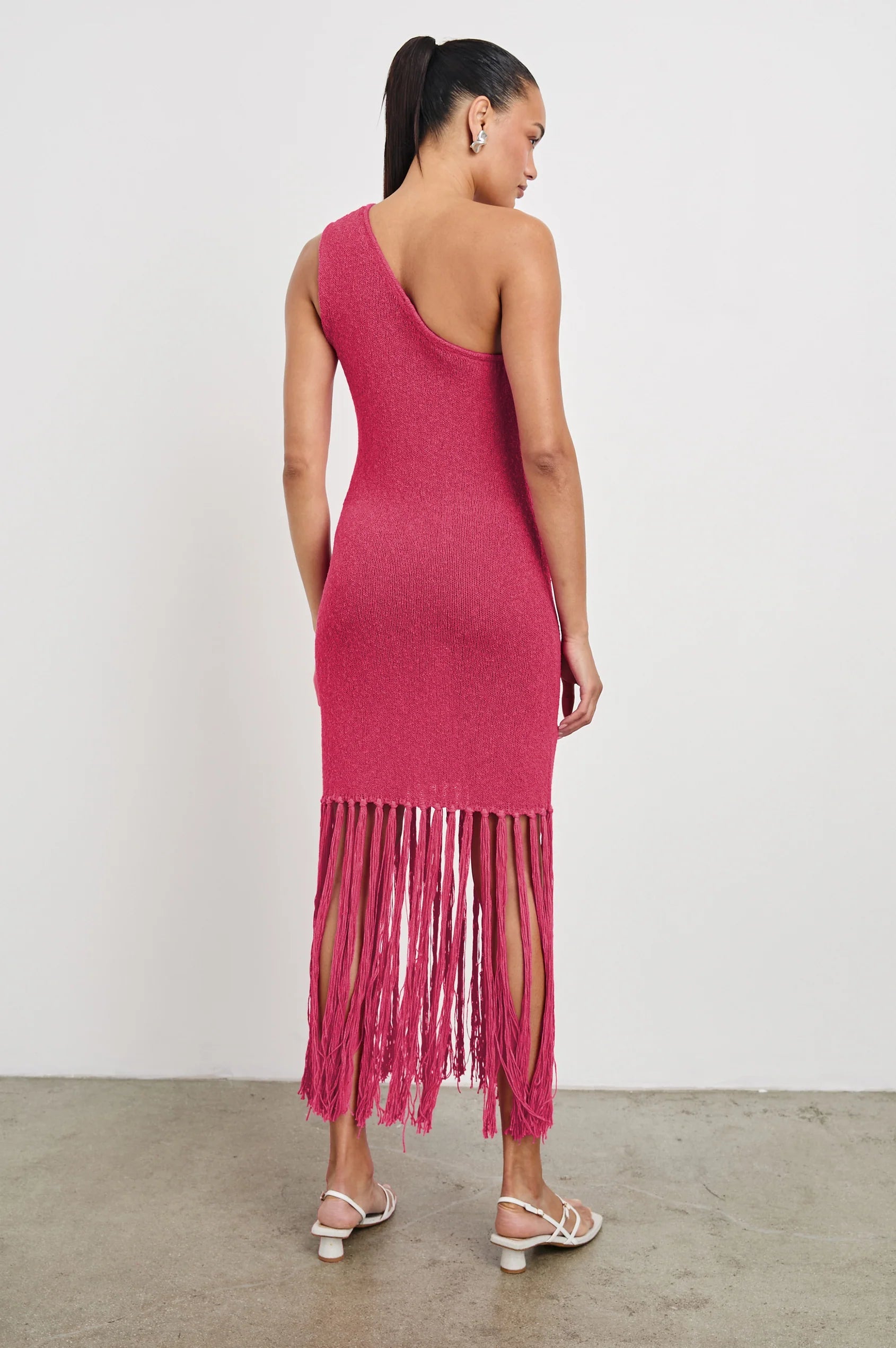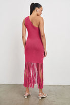 Not your average midi. Antonia features an asymmetrical neckline and knotted fringe detailing, all crafted in a cotton-linen blend for breathable comfort.
