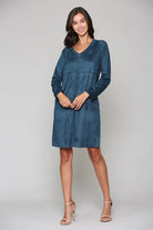 Our Aurora dress. Crafted with faux stretch suede that elevates its beauty. Features a V-neck, long sleeves, and pockets. Incredibly soft and comfortable. Can be worn as a dress or tunic, making it a versatile choice. It's our #1 best-selling style, timeless, classic, and effortlessly chic with its relaxed fit.