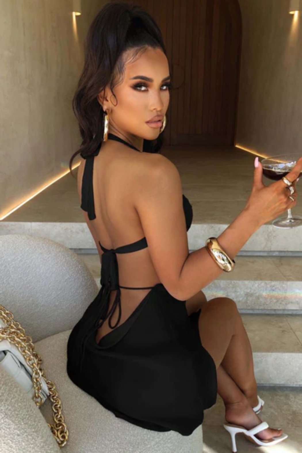 Backless Halter Neck Cut Out Dress Hollow Out Micro Mini Black Cocktail Dress