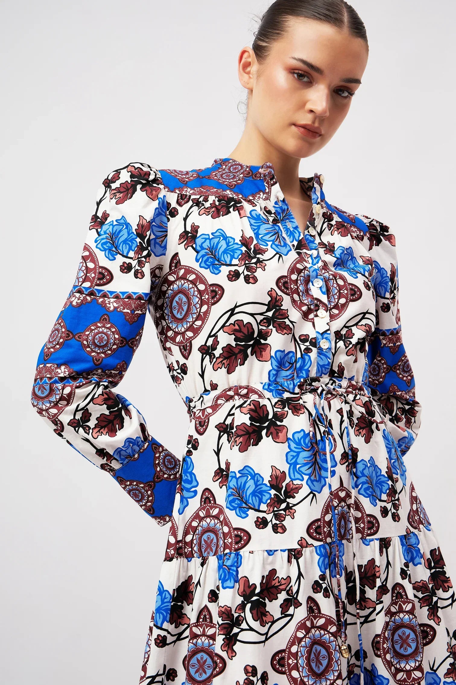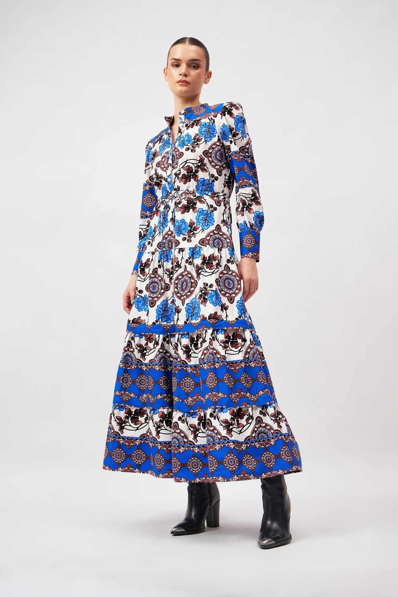 The structured sleeves, together with a romantic tiered A-line make the Sissi dress an instant icon. The self-tie cinch waist guarantees an impeccable fit. The collar ties feature custom brass embellishments with Moroccan engravings. Inspired by the rugged charm of the Atlas Mountains, this print references the diverse foliage and the terracotta landscapes of Morocco's iconic mountain range.