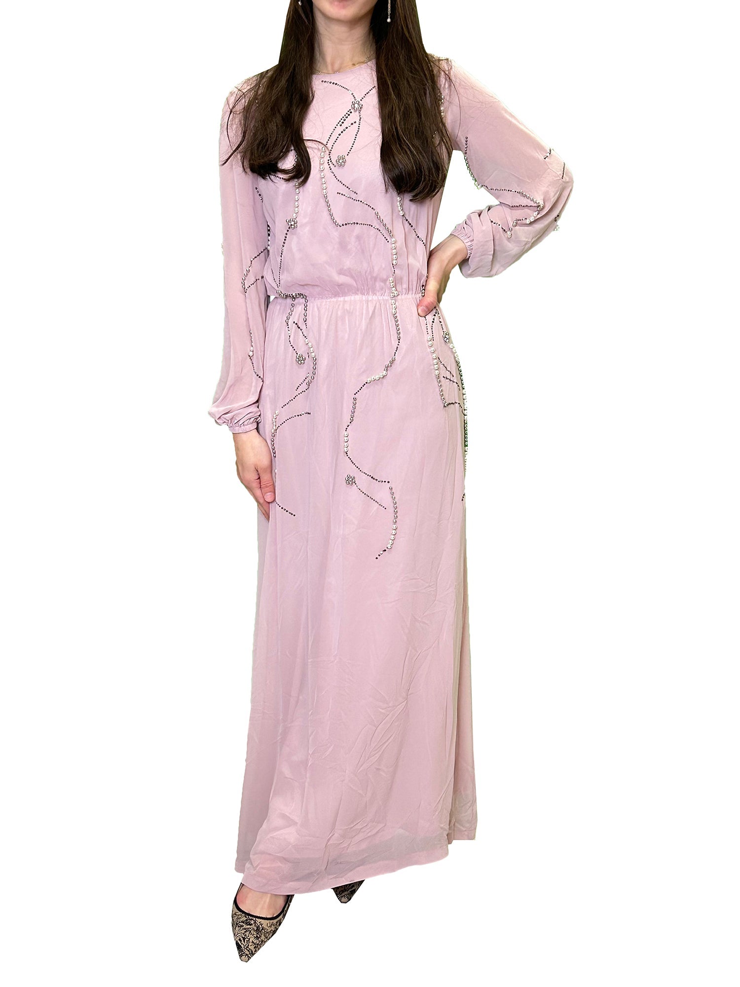 •LOOK: Let Bianco Nero dress you for your next special occasion. This is a magnificent dress with faux pearl and dainty studwork enhancing the sheer and solid play of the fabric. The sleeves are long, full and sheer, but can be lined upon request. The dress is gown length but can be shortened, if desired. Available in different colors. This is an impressive piece and you will look spectacular when you enter the room.