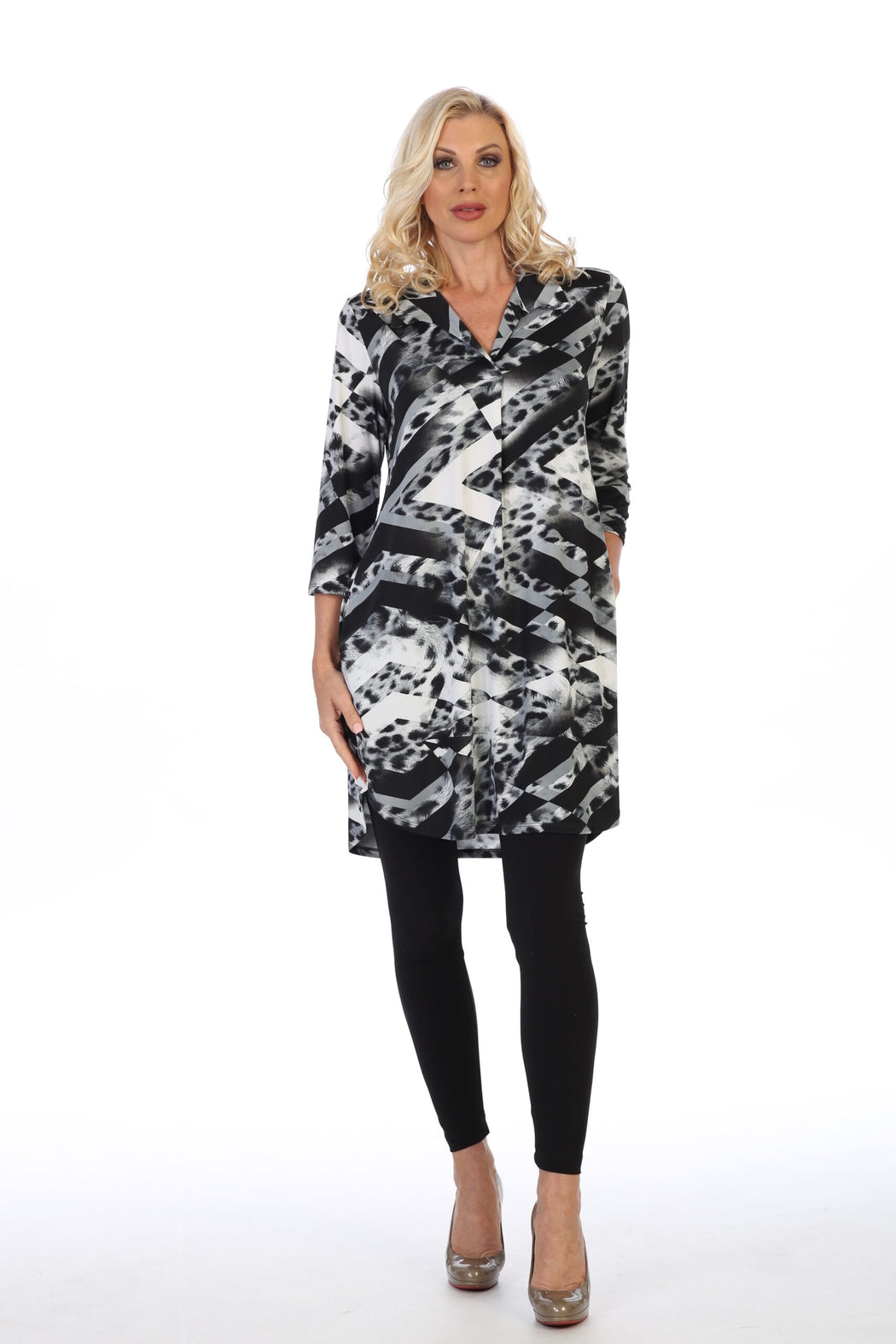This black & white tunic dress is perfect for all year long. You can wear it by itself as a dress or add some leggings to it to wear it in the fall and winter. This fabric does not wrinkle so it is very easy to travel with.