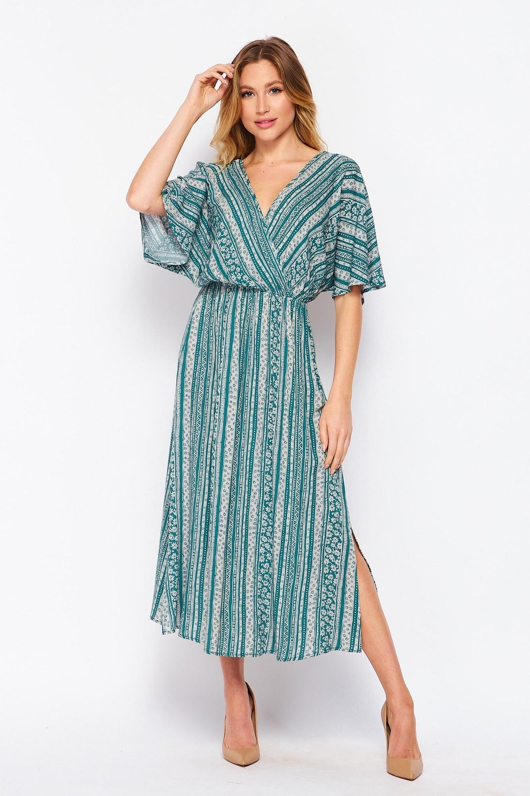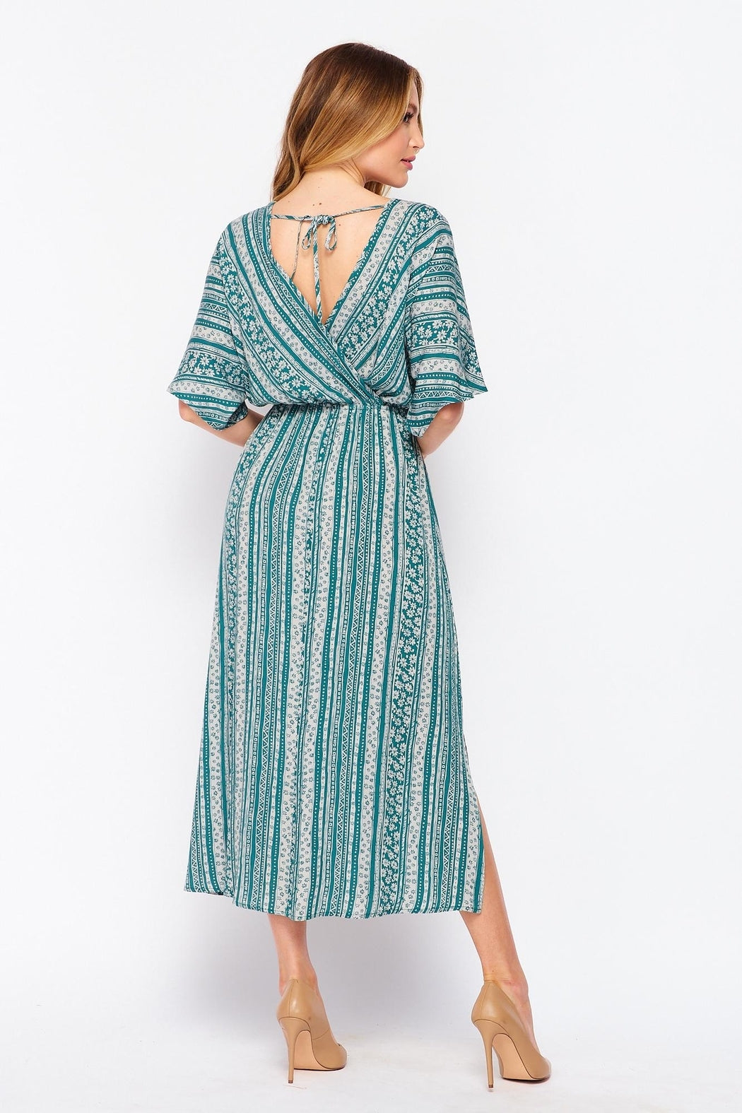 How cute is this dolman sleeve dress? It is a mid-length dress that is a green and cream color. This is the perfect dress for spring, summer, and fall. You can dress it up or down with your shoe choice. It does have a tie in the back that is adjustable so you can make it as tight or lose as you would like. This dress also features slits up the side to make it nice and flowy. This is a very boho style dress.