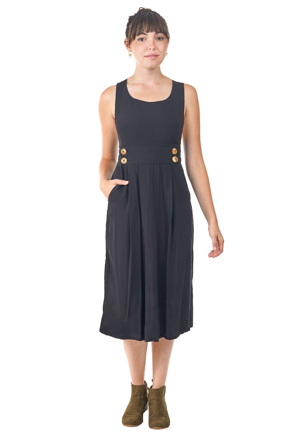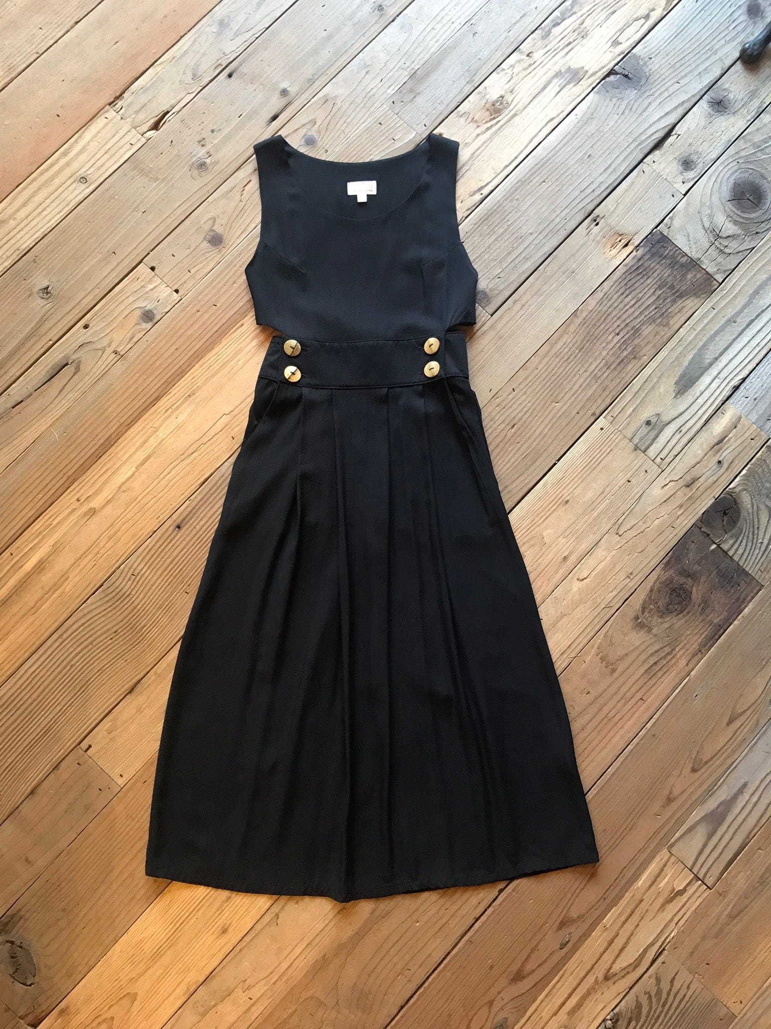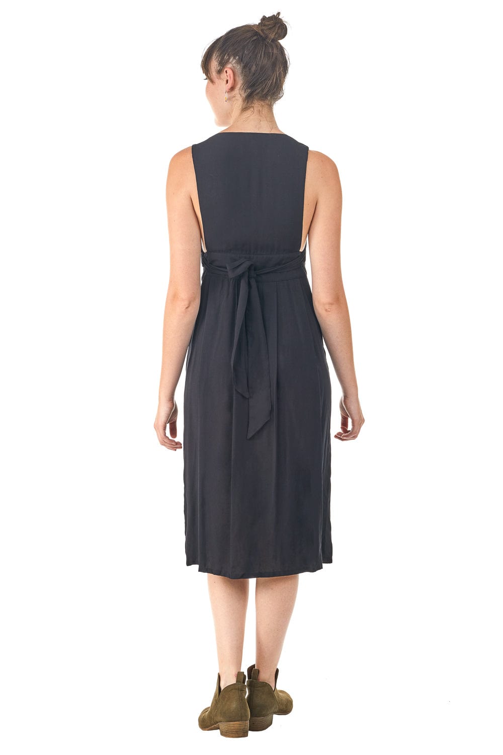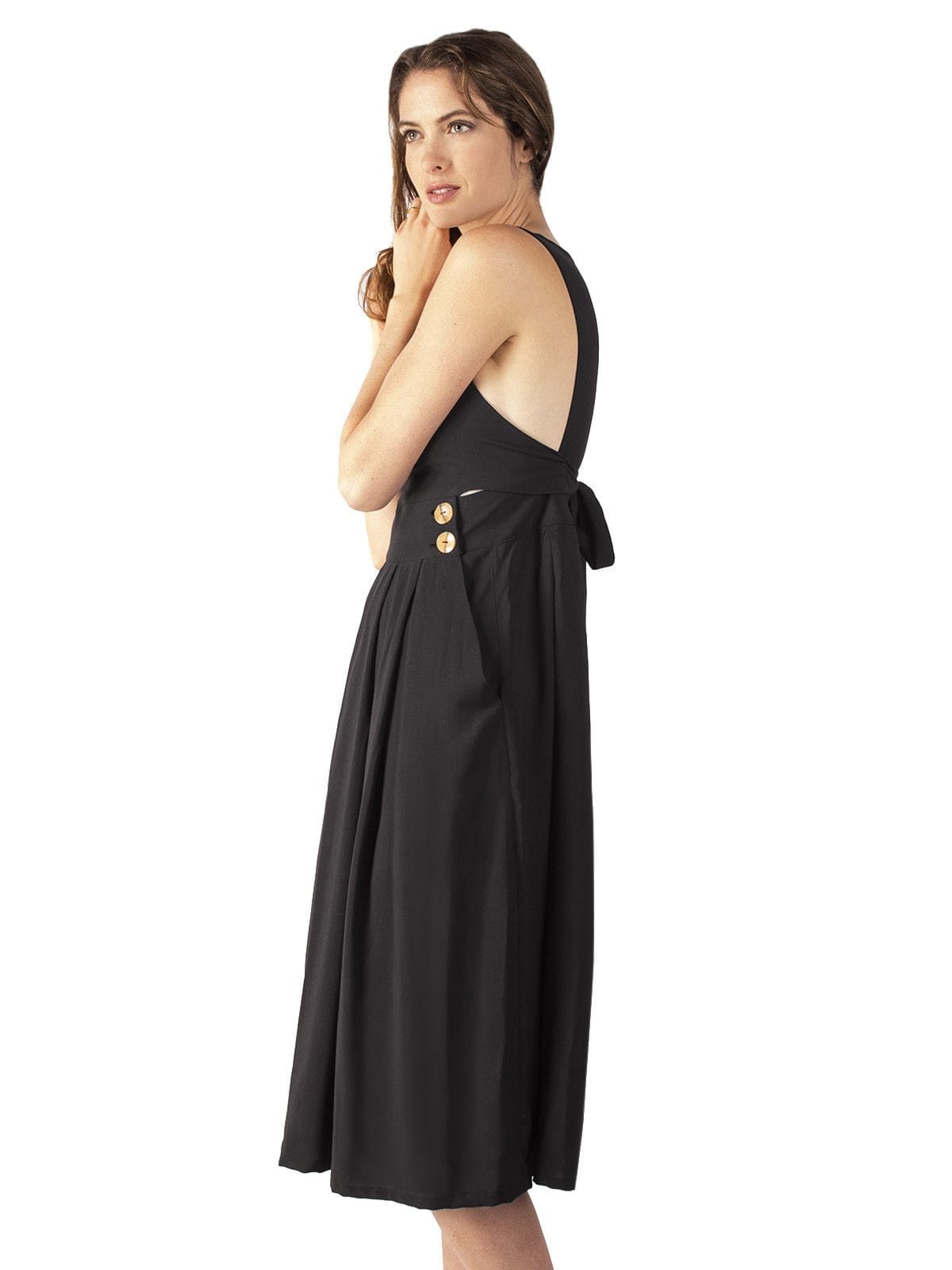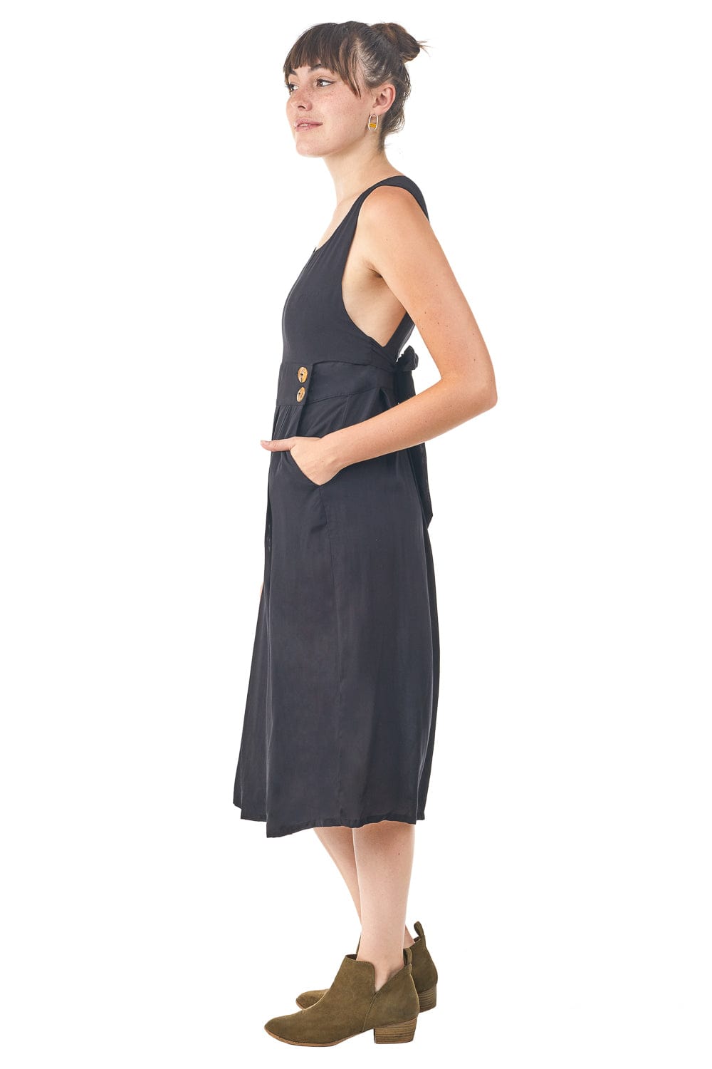 Bamboo button-up closure at the high waist. Long strap that ties around the low back. Added sexy touch with a little (not too much) side-boob. Wear with nothing at all or with a tank or shirt underneath, works well with a long sleeve in the winter.