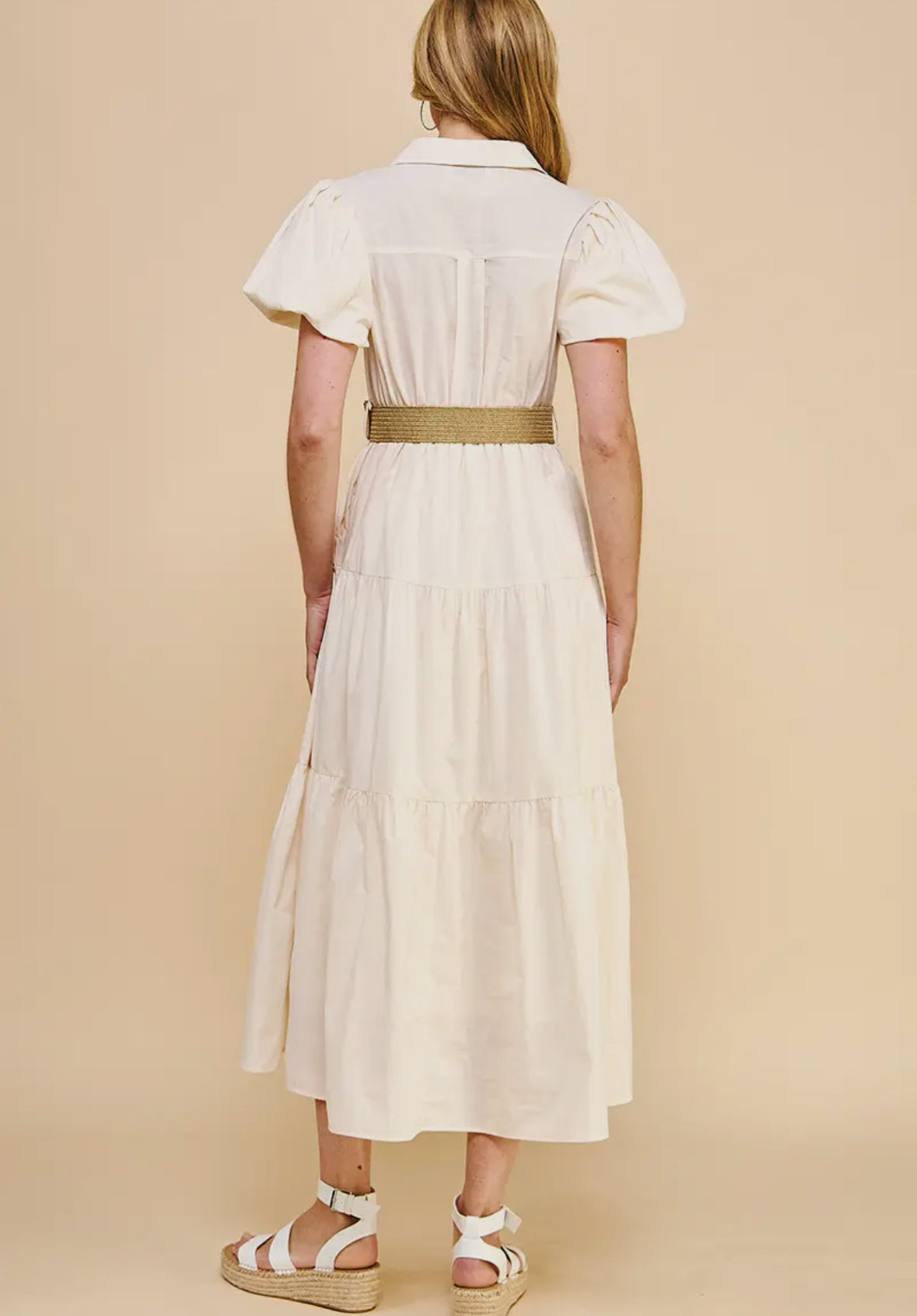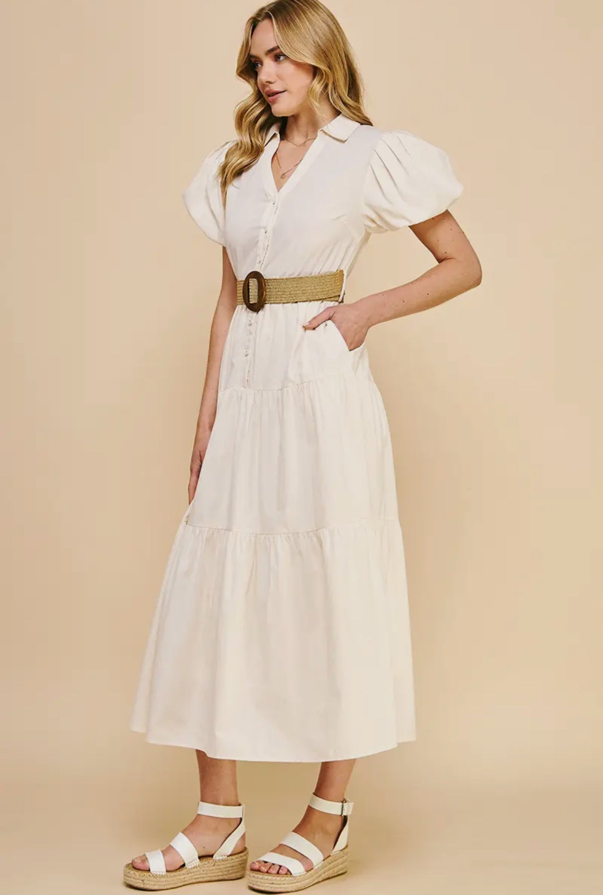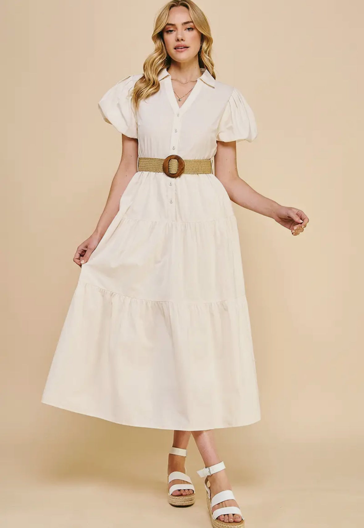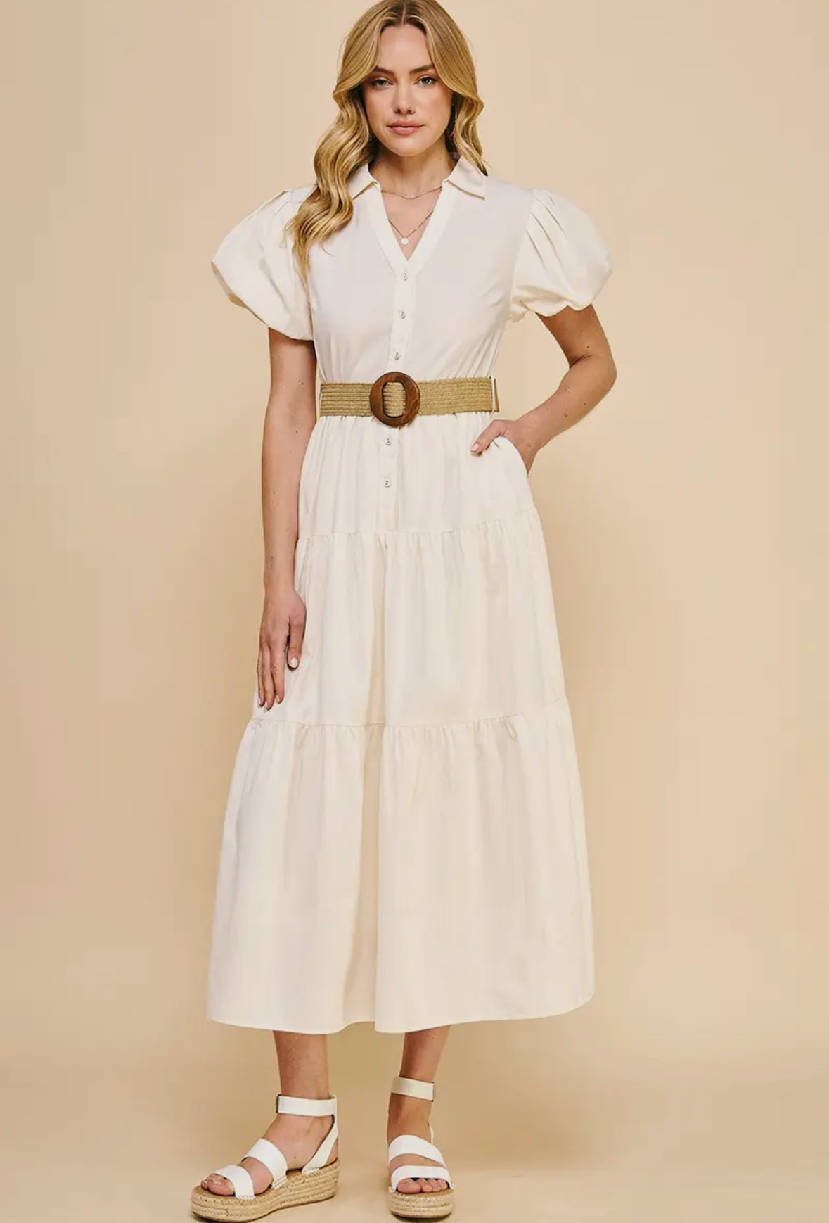 This cream tiered button down beauty feature a puff statement sleeve, and detachable belt. We love the classic style of this piece.