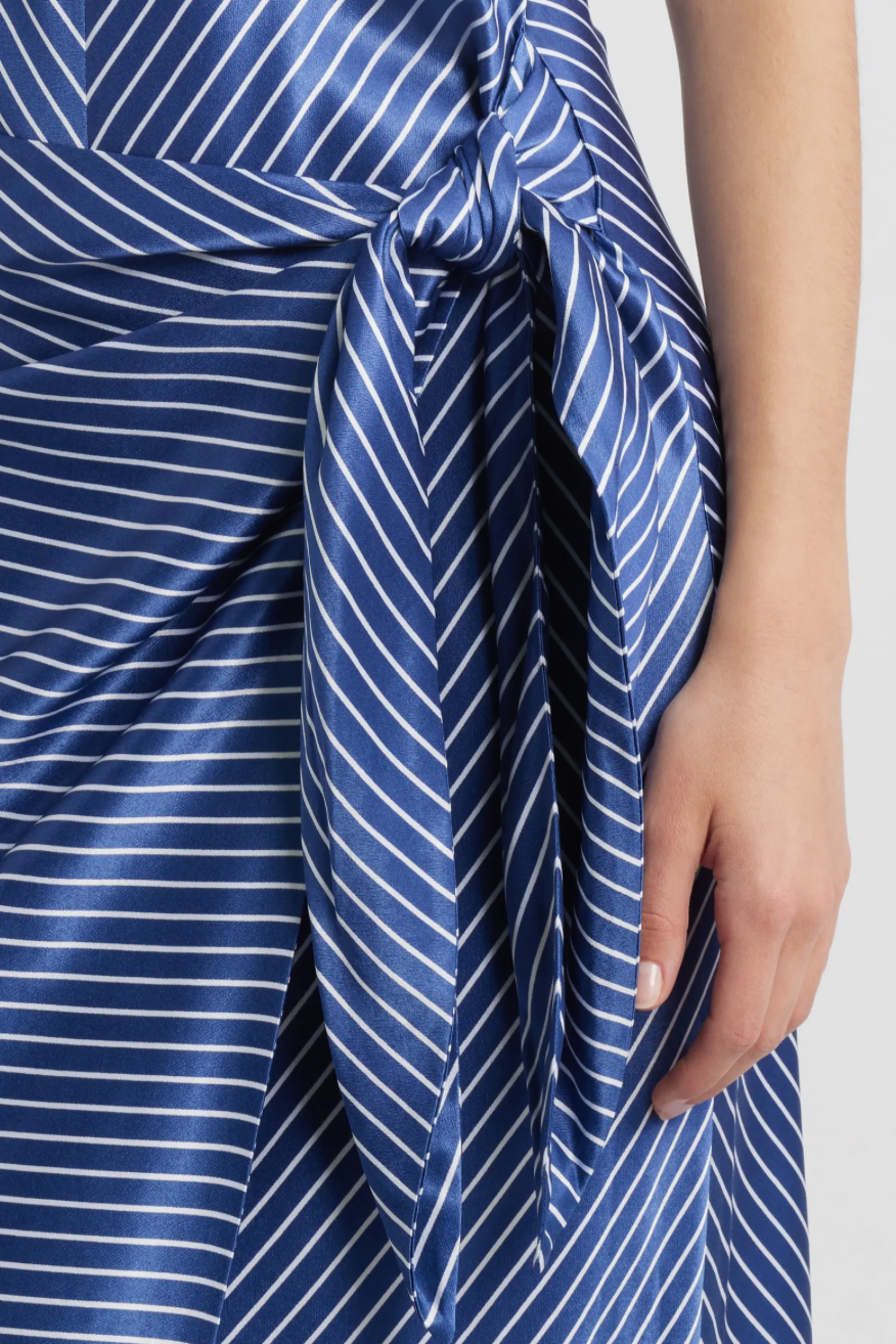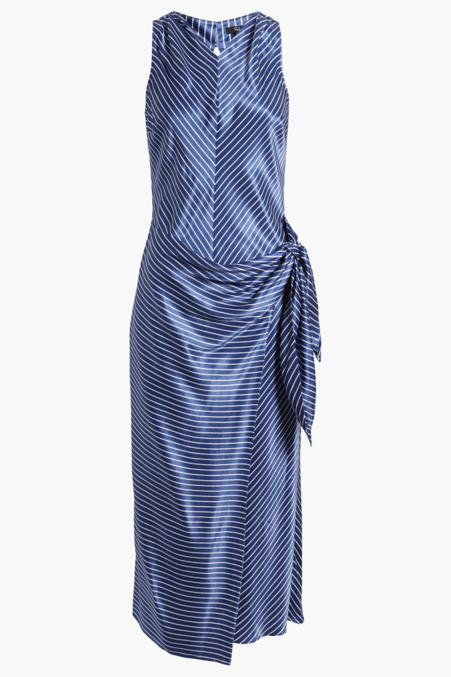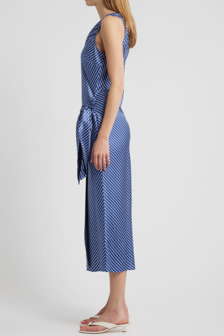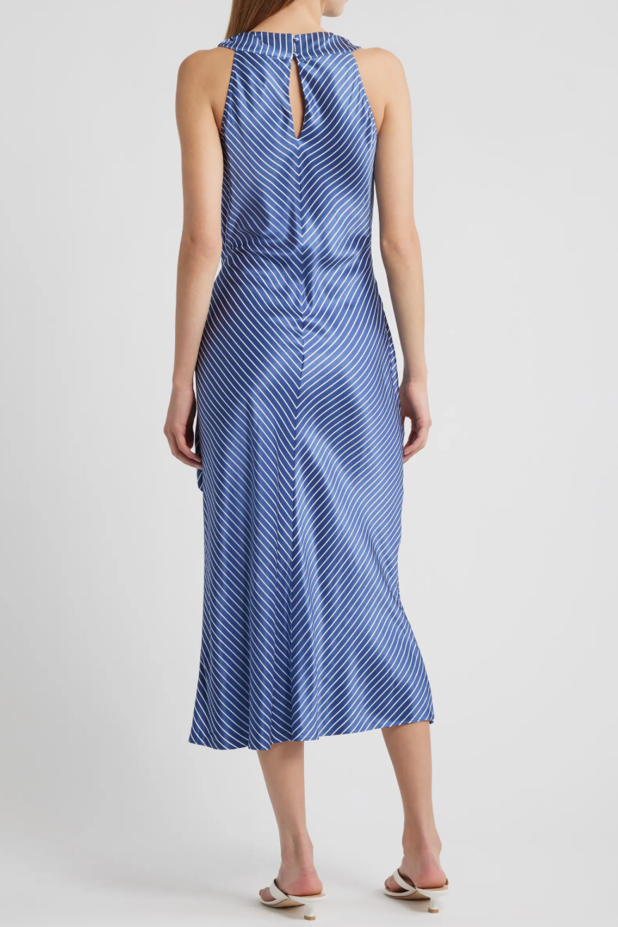 A drapey side tie shapes this silhouette of this sleeveless midi cut from glossy satin.