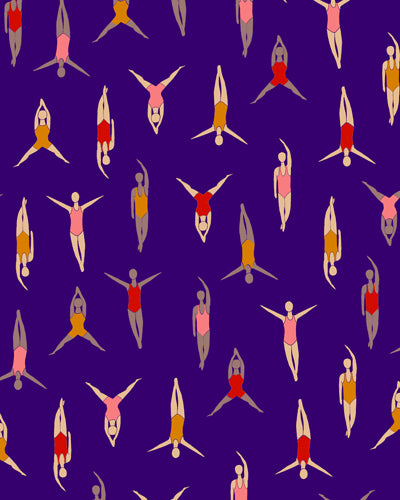 Introducing the Swim Print, a playful piece featuring a purple/blue background and spunky synchronized swimmers. Perfect for those who like to make a whimsical statement while still looking effortlessly stylish. (Swim-tastic!)