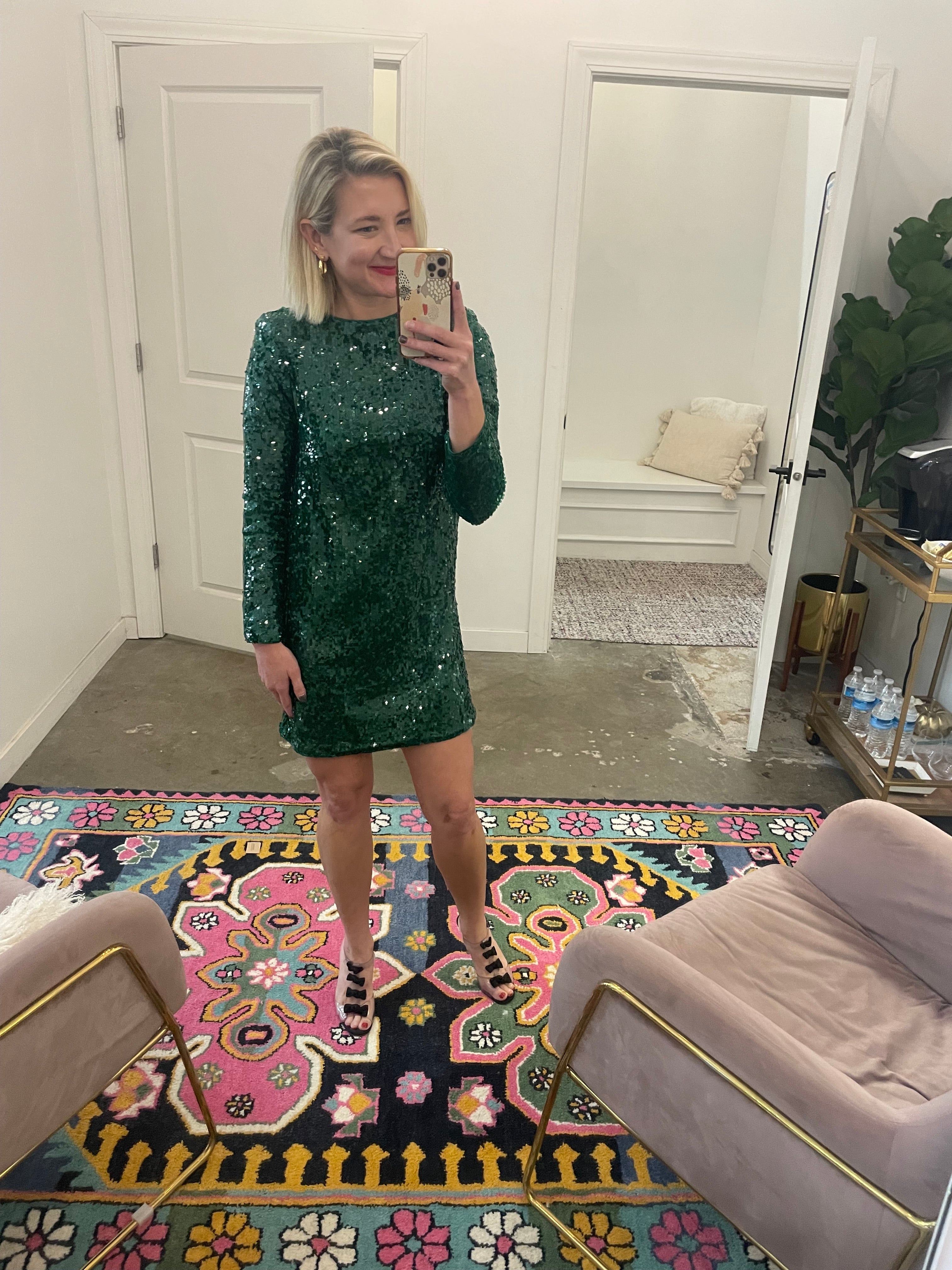 Who doesn't love sequins?! This green sequin shift dress is perfect for the holiday season!!