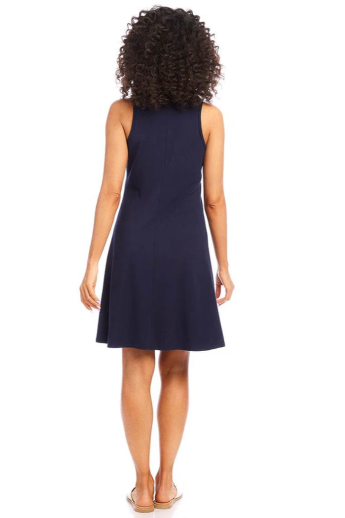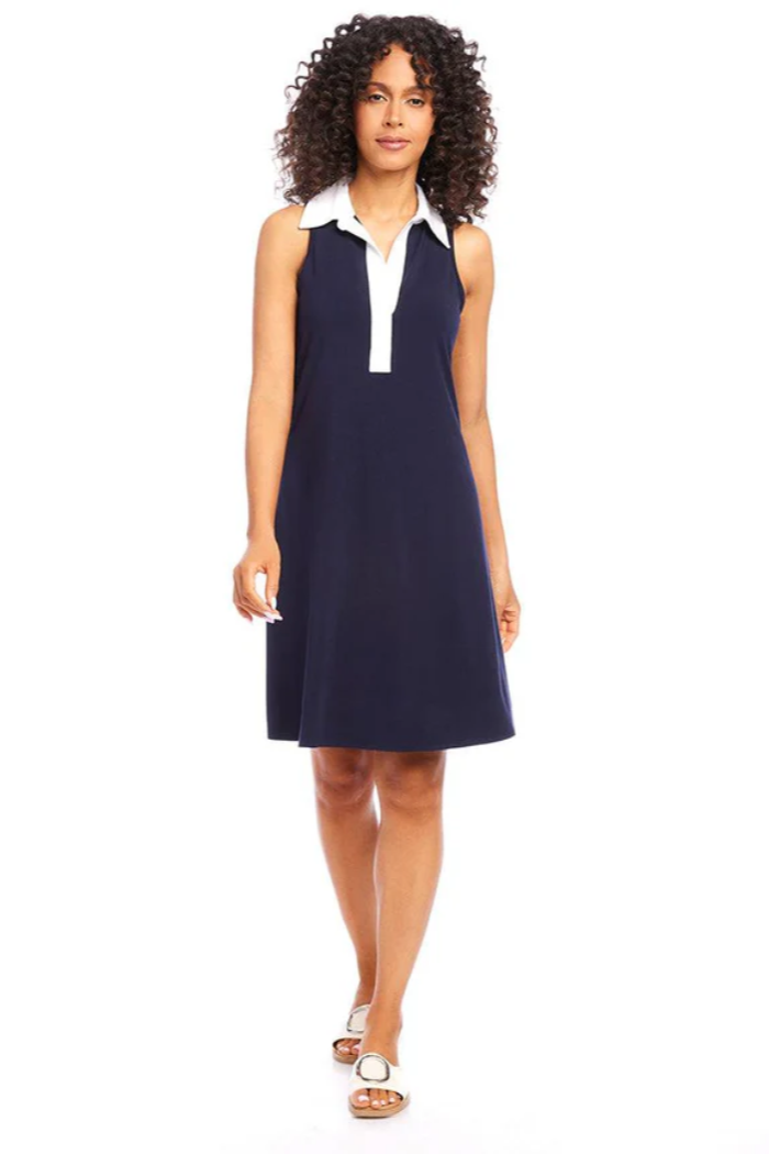 This sleeveless dress features a crisp contrast placket and classic collar for a clean, modern look. Made from soft jersey with a touch of stretch, it falls into a flattering A-line shape that hits just above the knee.
