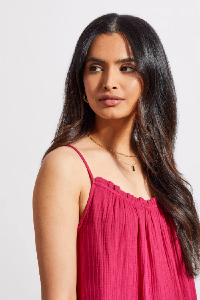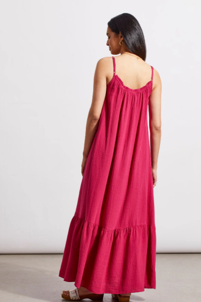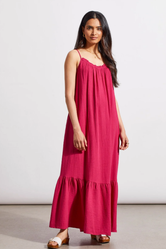 Polished and practical, this sleeveless maxi dress is a must-have addition to your closet. We're obsessed with the flowy fit cut from crinkled gauze cotton, rich colorway options, scoop neckline with frilled details, and side seam pockets for stashing on-the-go items.