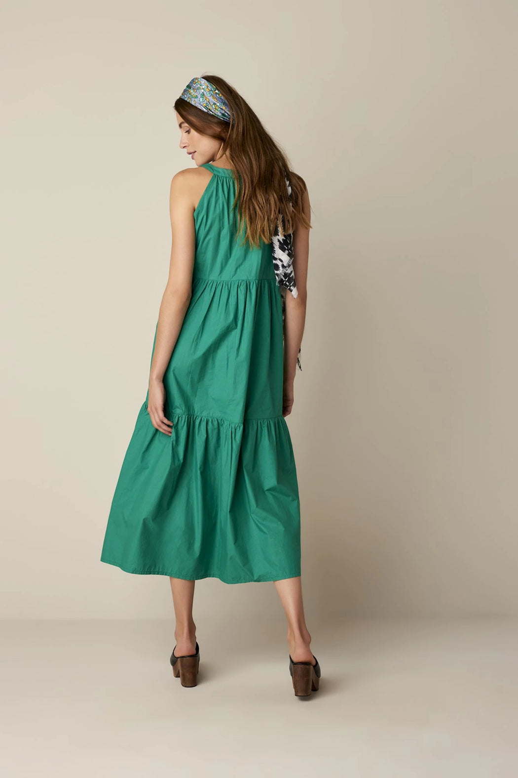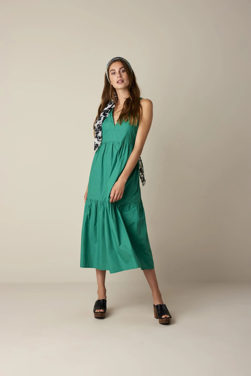 A cotton maxi dress with cold shoulder neckline and a V-spilt in the front.