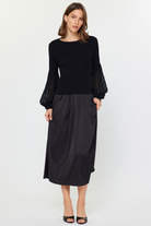 Elevate your wardrobe with this refined two-piece ensemble. The ribbed round neck sweater features elegant balloon sleeves with delicate sheer detailing, offering a modern silhouette with understated sophistication. Pair it with the coordinating cami dress, designed with an elasticized waist for a flattering, comfortable fit. Perfect for layering or wearing separately, this versatile set transitions effortlessly from day to evening occasions.
