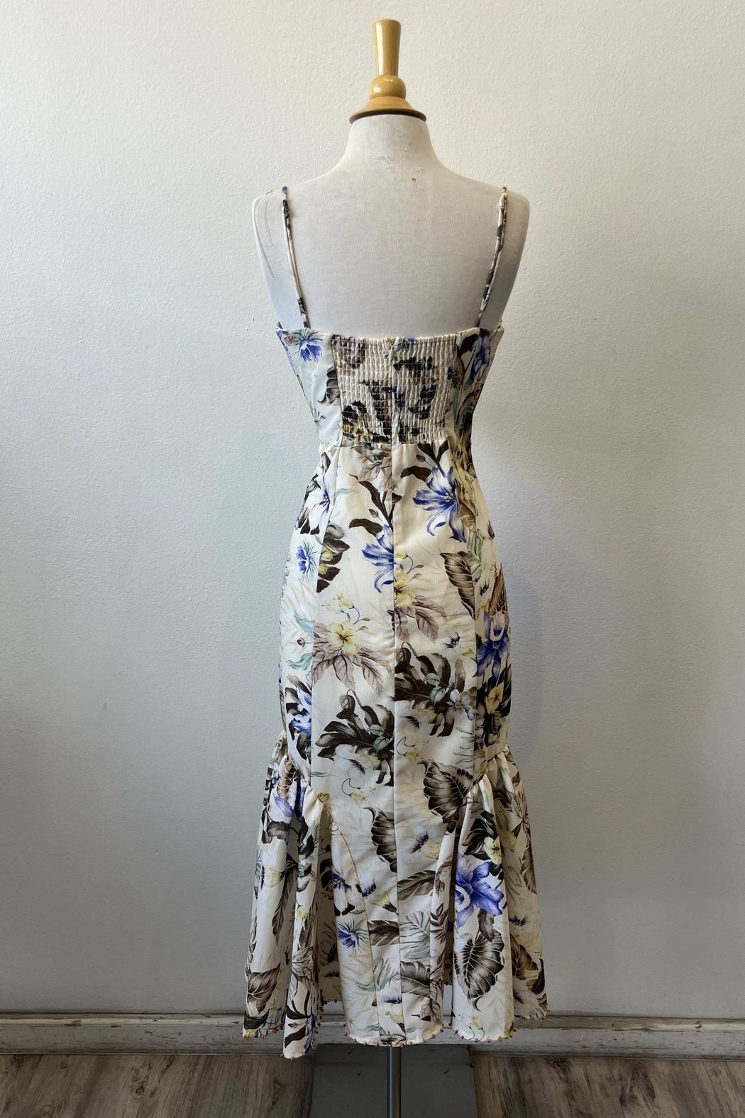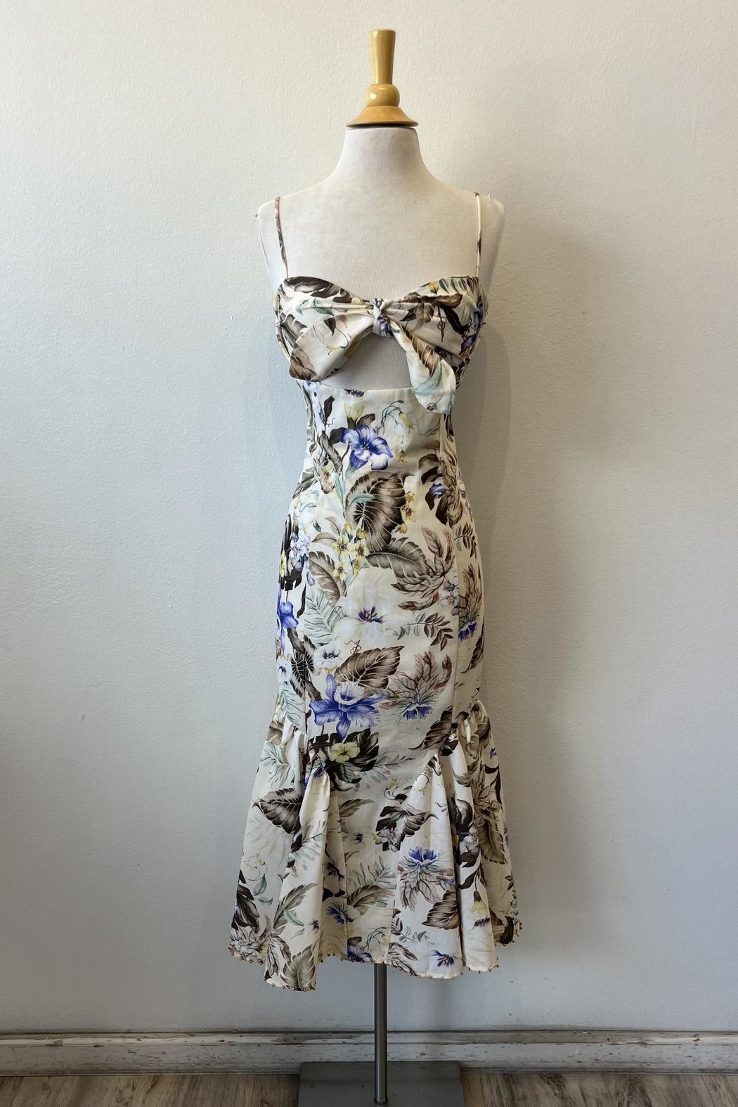 Front bow cut out floral dress. Mannequin is wearing a size Small