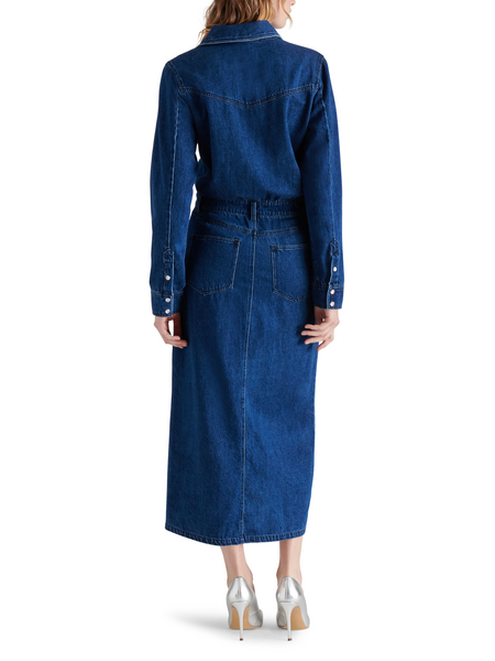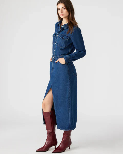 Elevate your wardrobe with our Dakoda Dress. Crafted with a denim long-sleeve bodice, button-down maxi dress, and shank to zip front skirt, this dress exudes effortless style. The center front slit adds a touch of femininity, while the skirt pockets provide both convenience and practicality. Perfect for any occasion, this dress will be a staple in your closet.