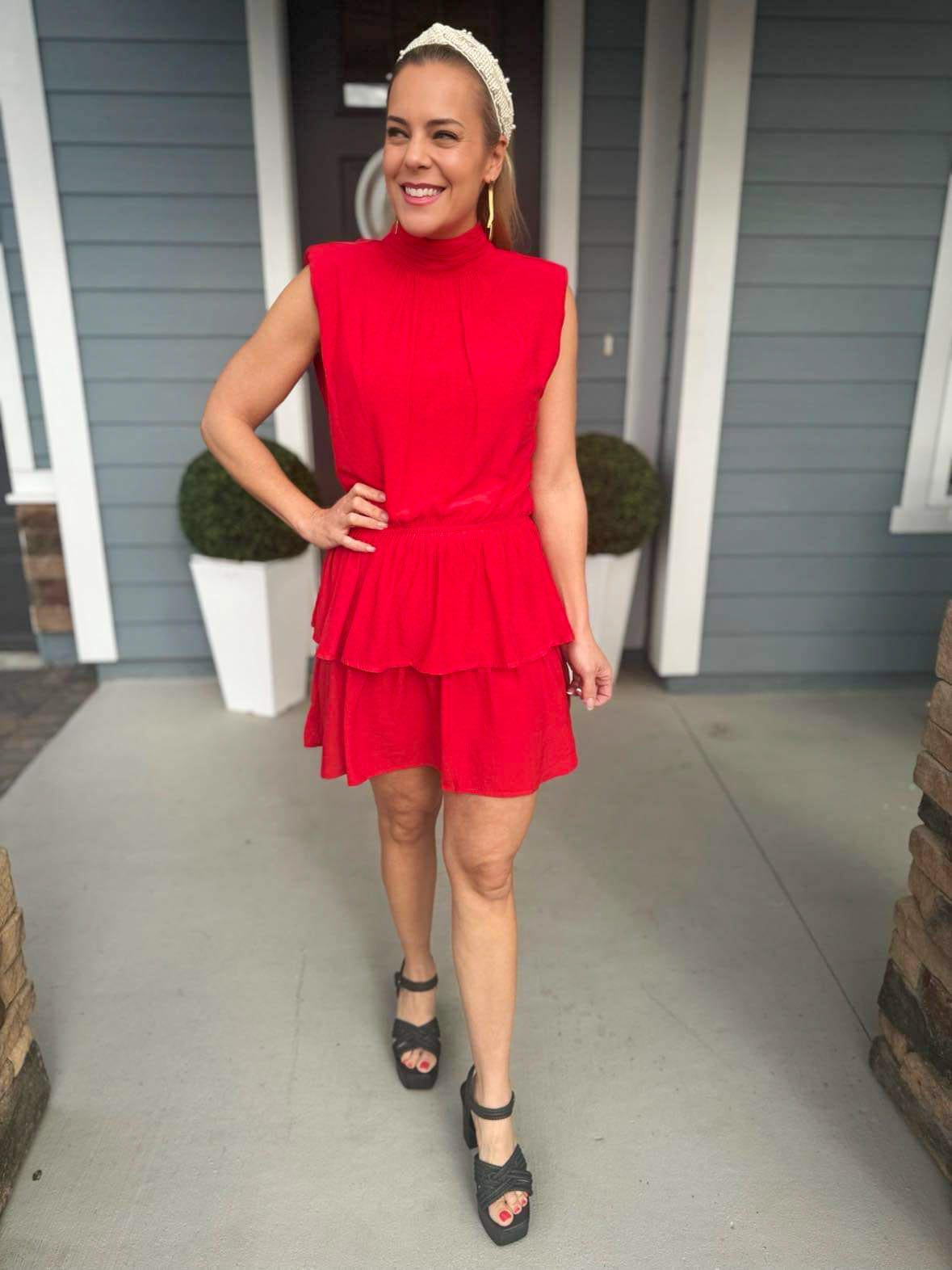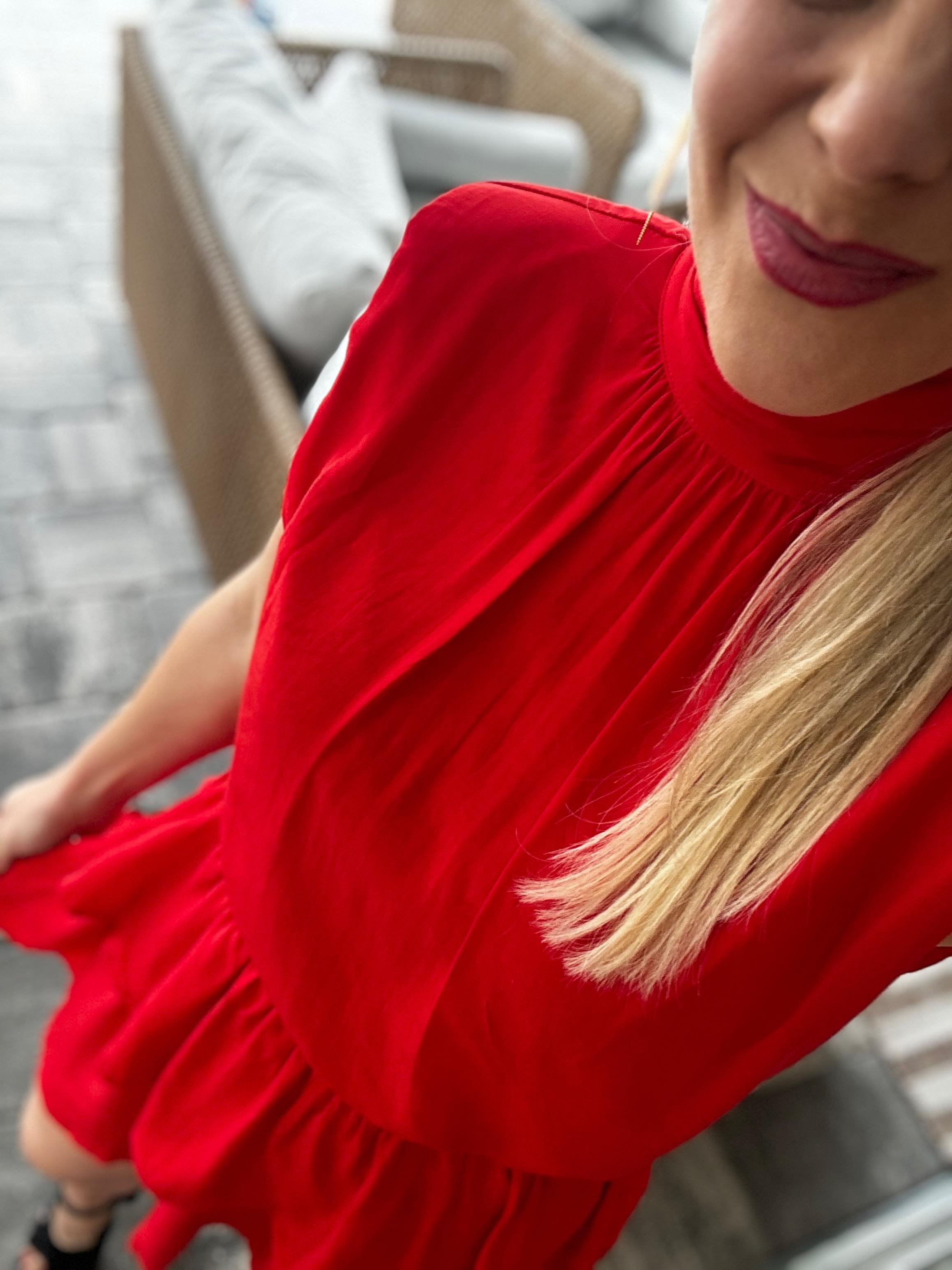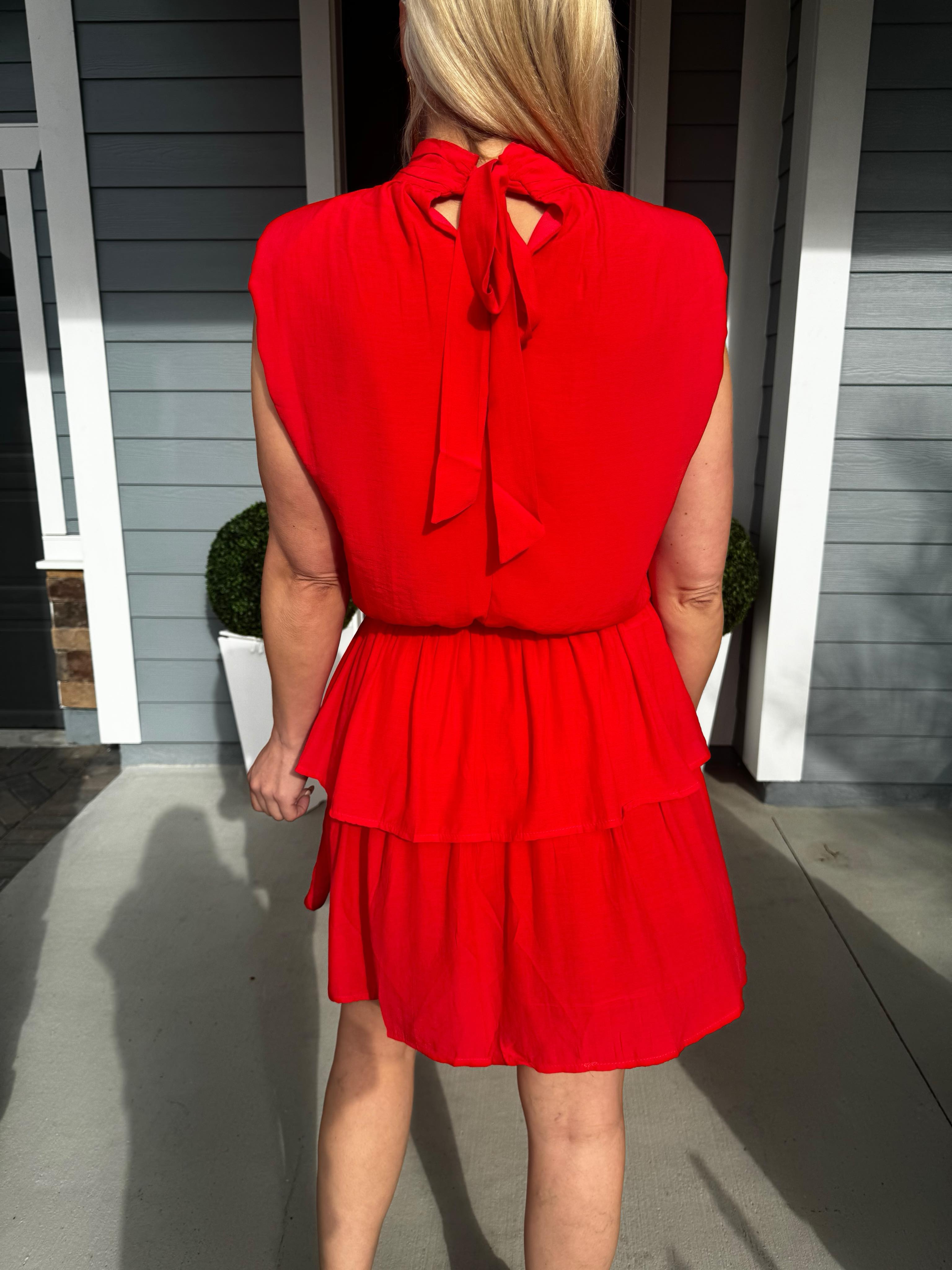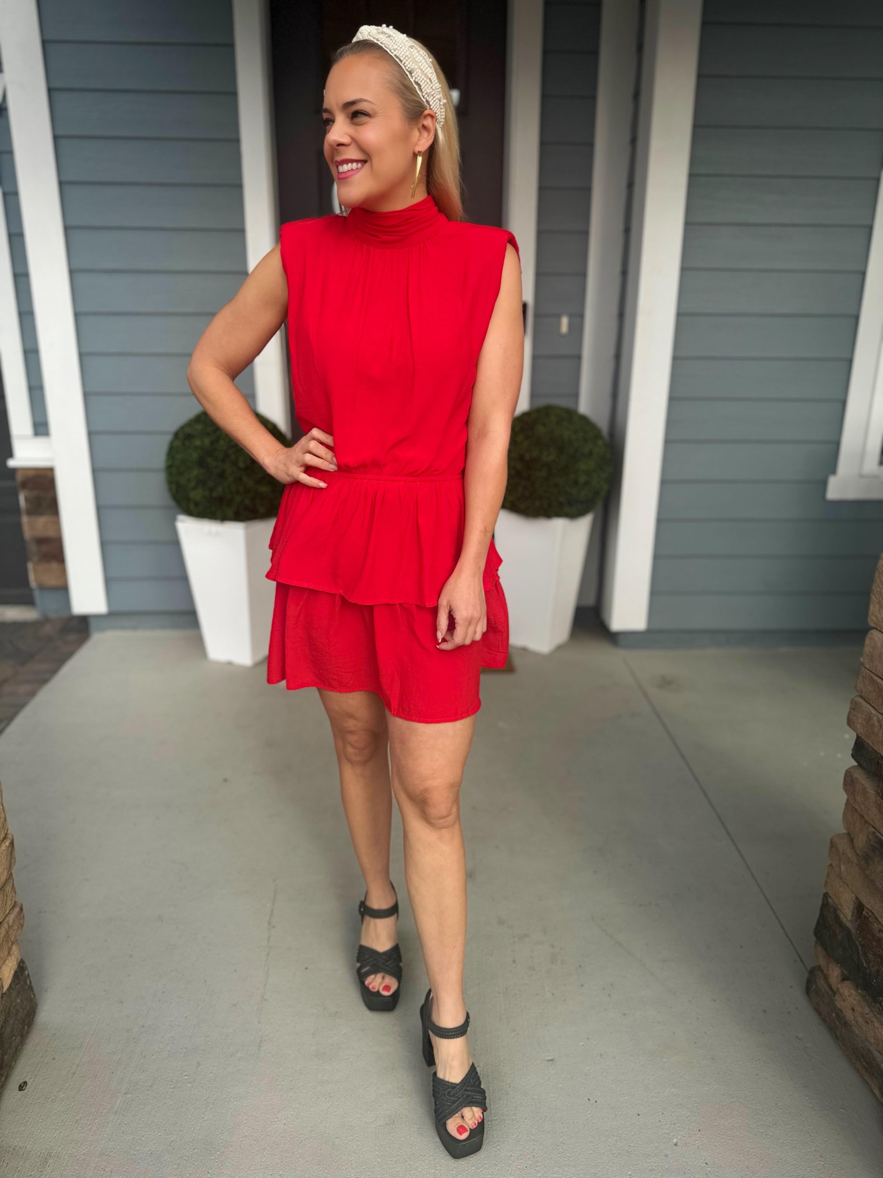 Red is trending for Spring and Summer and this sleeveless dress by TCEC is a gorgeous piece to add to your closet. Featuring a double ruffle skirt, elastic waist, mock neck with tie at the neck, a thin shoulder pad you'll be showing everyone up on the dance floor!