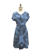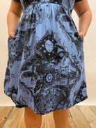 Easy to wear slip on design with back ties for making it as fitted as you like on the high waist.  Joined together at center front & neckline with bias binding.  Dolman sleeves for the perfect arm coverage.  Gathered at the center front for a no cling fit.  deep pockets at the side seam that do not add bulk. Just above the knee length.  A loose yet structured look for the modern woman.