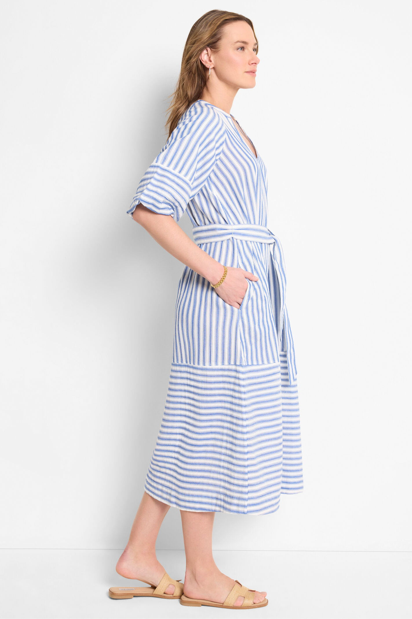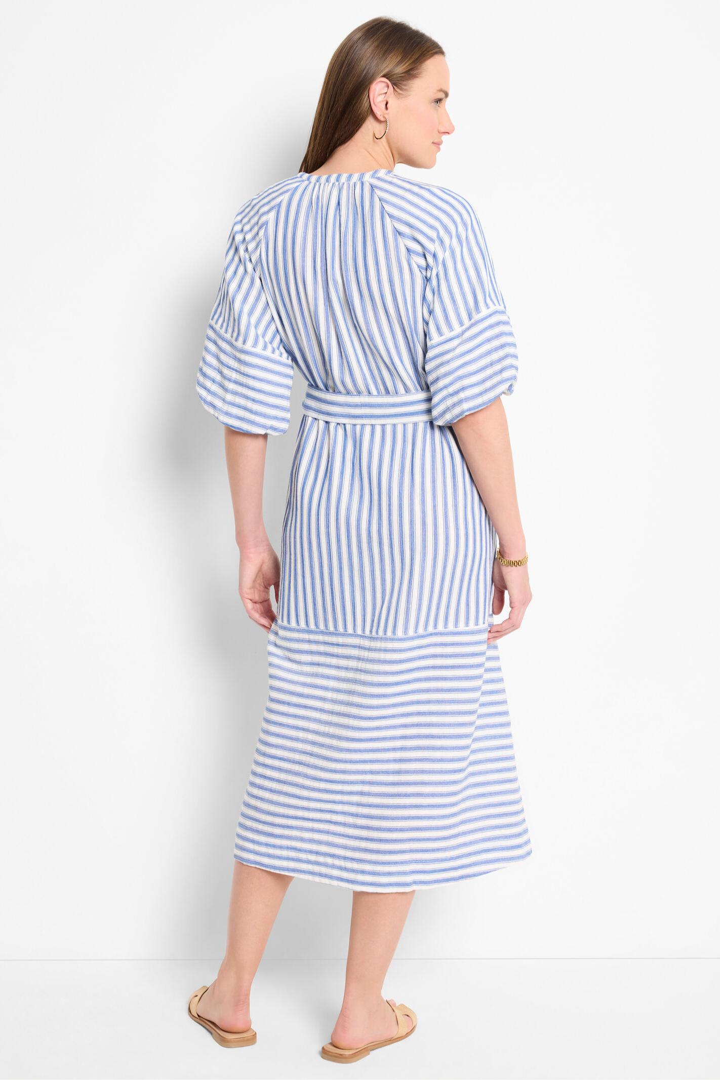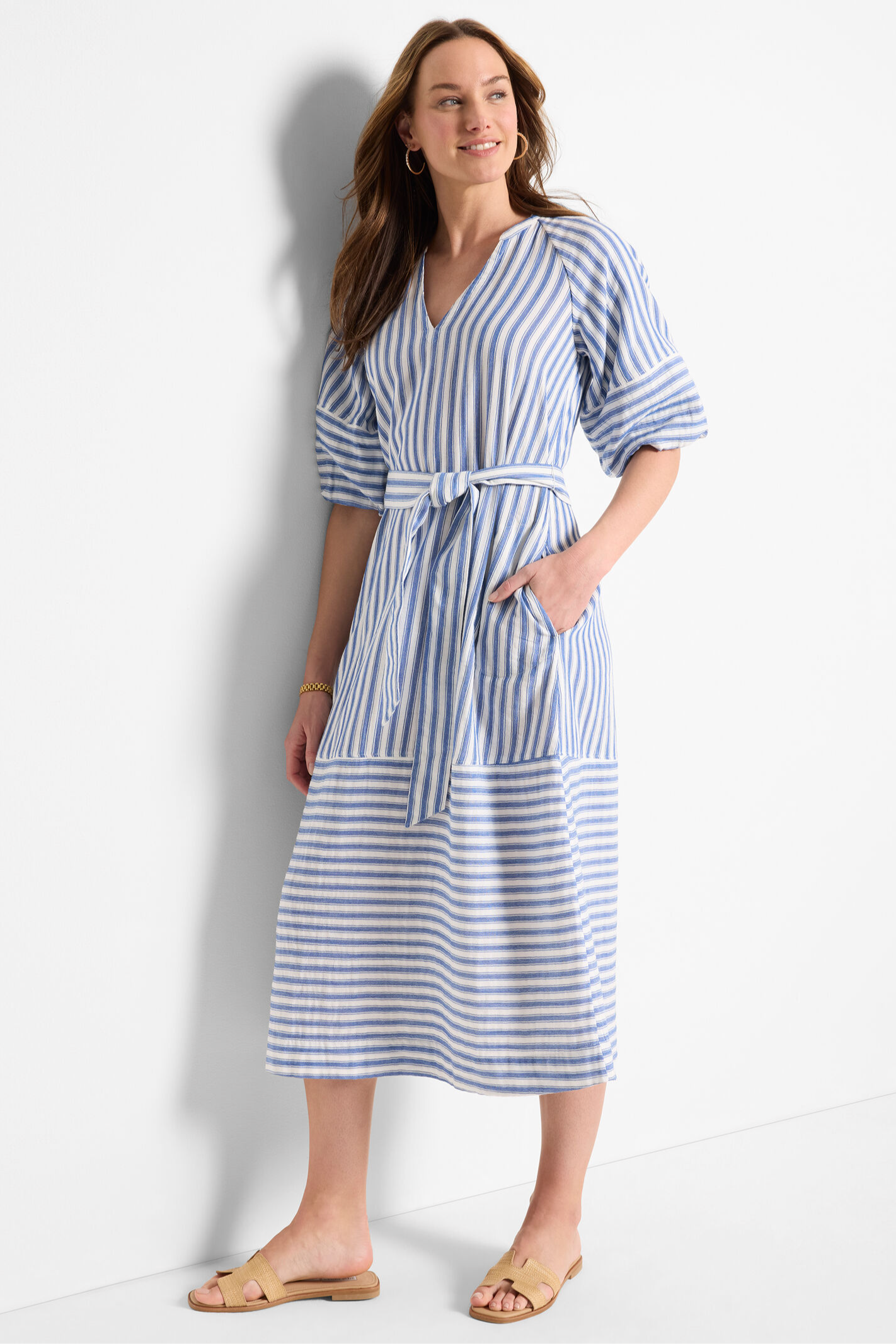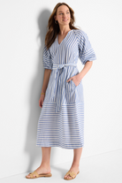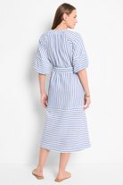 A fresh spin on a timeless classic. Featuring an airy, drapey construction, it features a flattering A-line silhouette that falls below the knee for an effortlessly polished look. Subtle balloon sleeves add a soft, feminine touch, while reverse stripe details bring unexpected contrast -- because even classics deserve a little twist. Designed for both style and ease, it's finished with a removable belt for a custom fit and side pockets for everyday versatility. Mindfully Made from cotton sourced from the world's largest cotton sustainability program.
