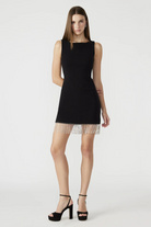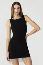 Expertly crafted, the ELENORA dress combines sleek design with intricate details. This sleeveless mini bodycon dress features stunning rhinestone fringe decals, creating a glamorous and eye-catching look. Perfect for any special occasion, this dress will make you stand out in the crowd with its unique and elegant style. Add it to your wardrobe for a touch of luxury and sophistication.