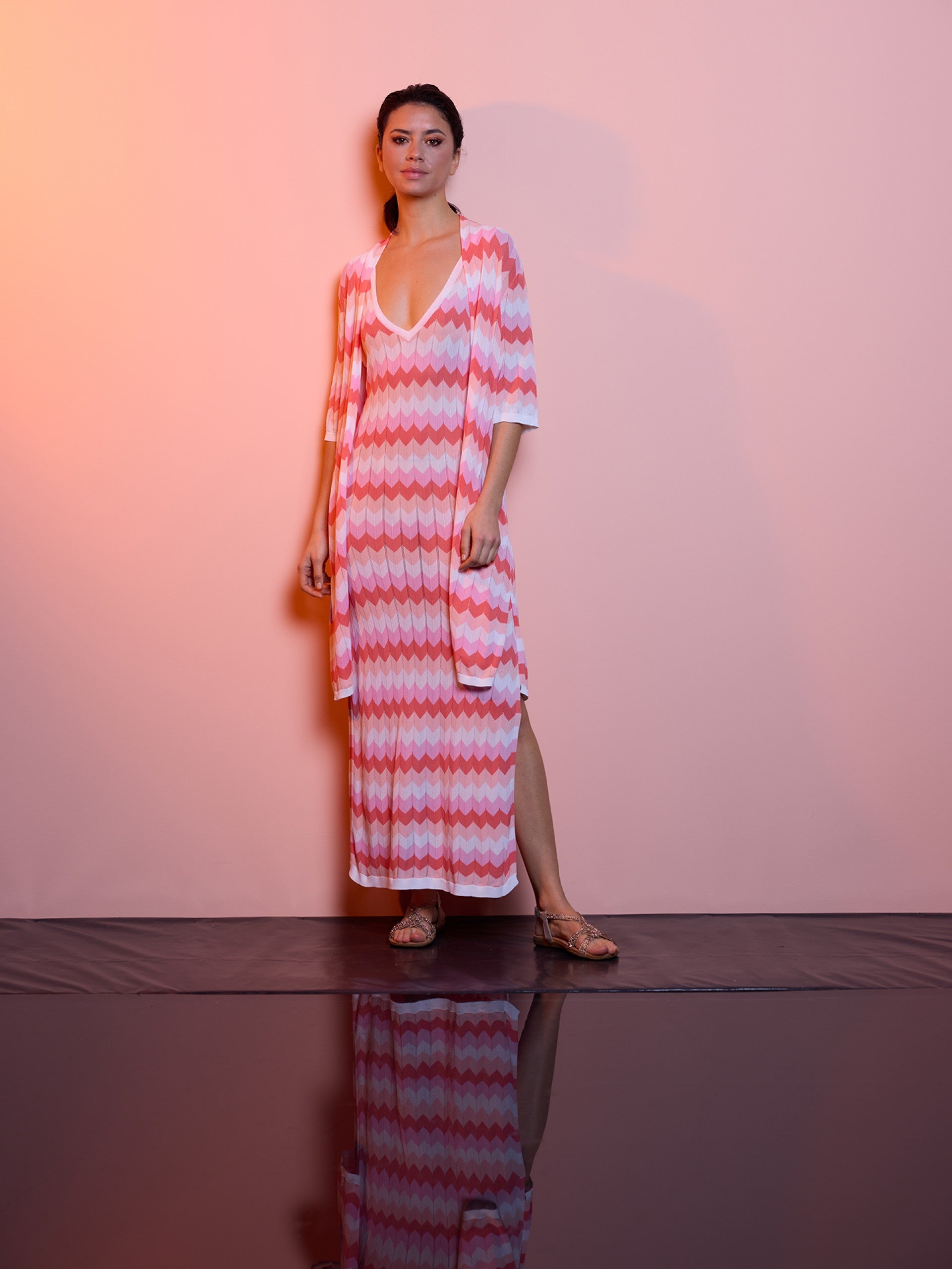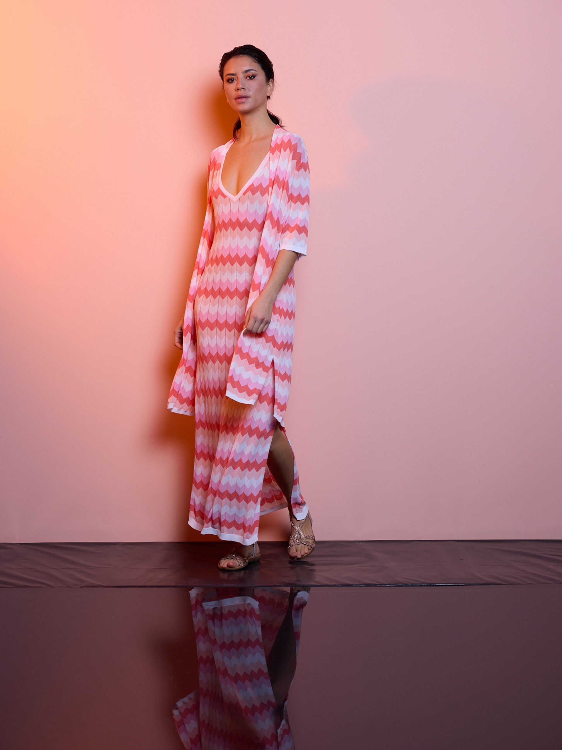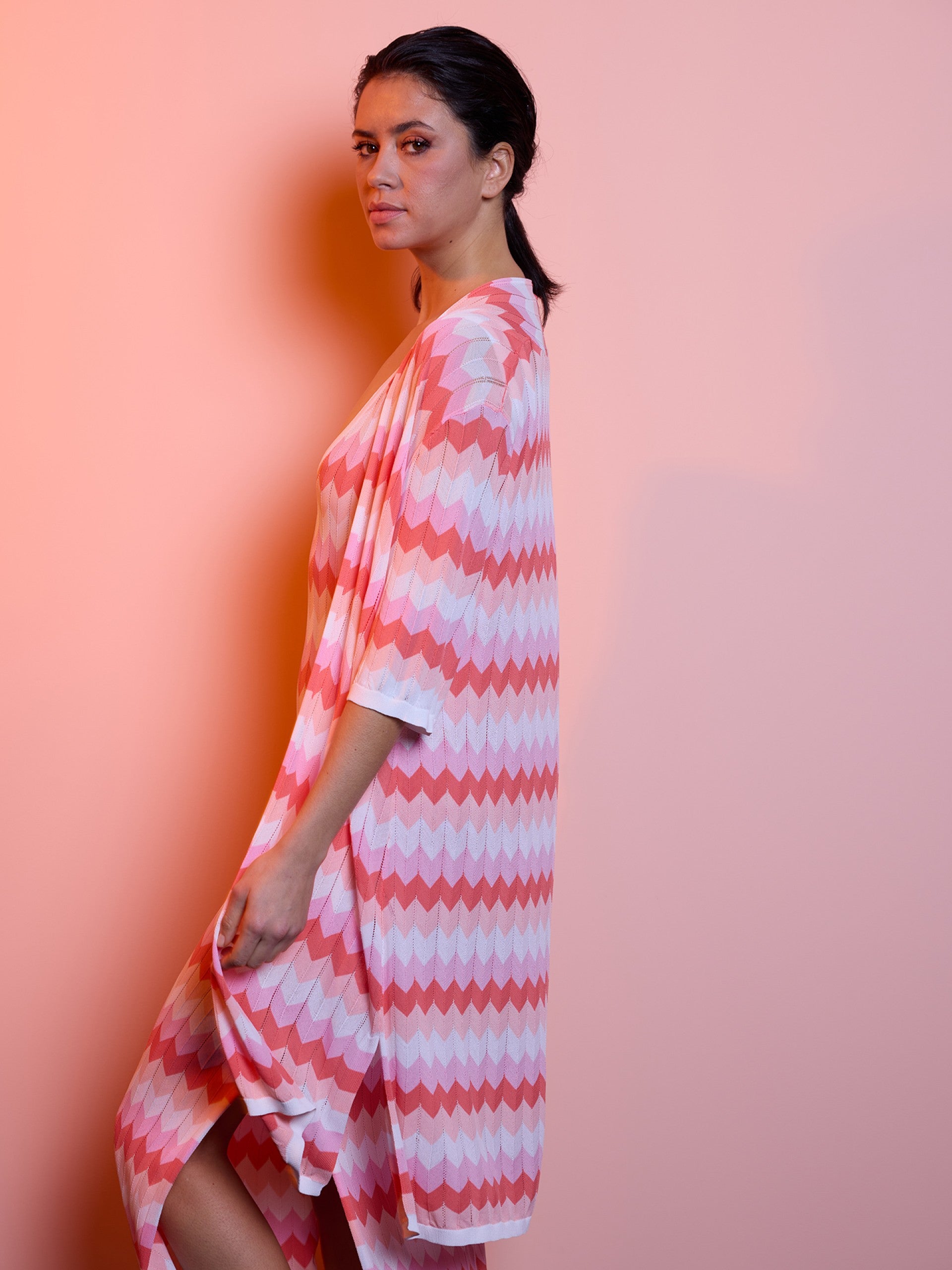 Crafted from a delicate knit, this piece features a latticed geometric design. Elbow-length sleeves and side slits add a touch of flair. Embellished with stripes for a playful touch.