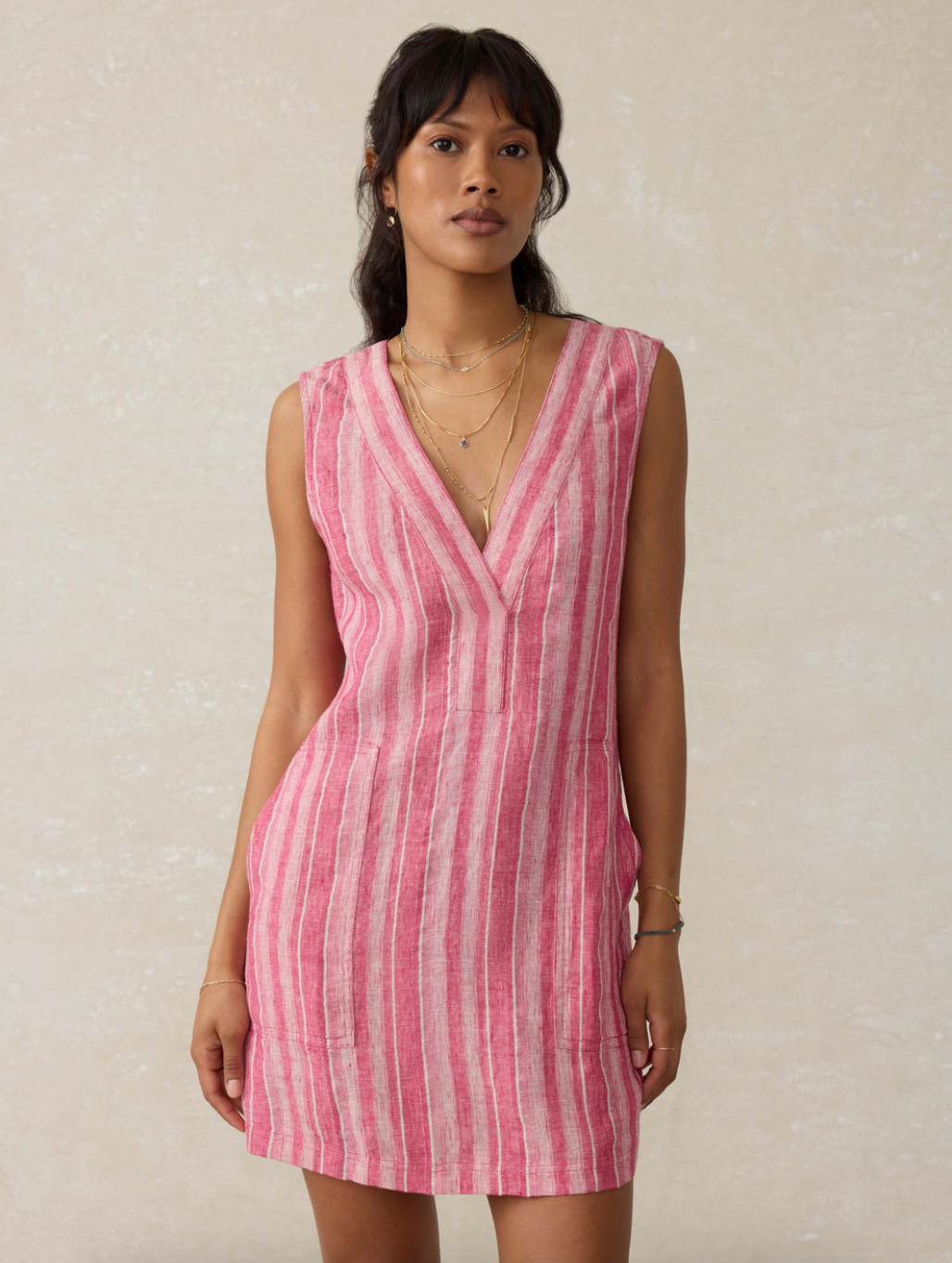 Introducing the Faherty Azure Dress - Granita Stripe. This V-neck dress features a clean, modern design with a touch of tailoring and functional patch pockets. Made from soft organic cotton, it's perfect for staying cool and stylish on warm summer days. Available in a playful print inspired by carefree moments. Length: 33". Model is 5'9 and wearing a size Medium. Care instructions included.