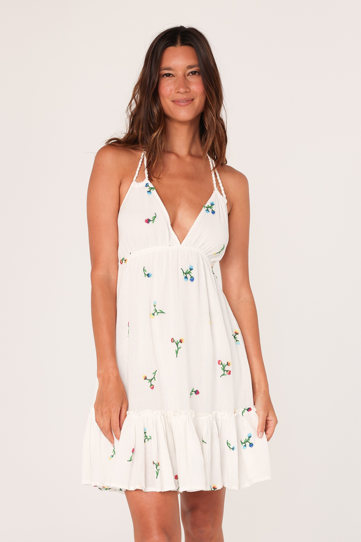 All over floral embroidered gauze mini dress perfect for the Summer season. Features a halter tie neck, v-neckline, ruffle trimmed hem, and open back with rope tie closure.