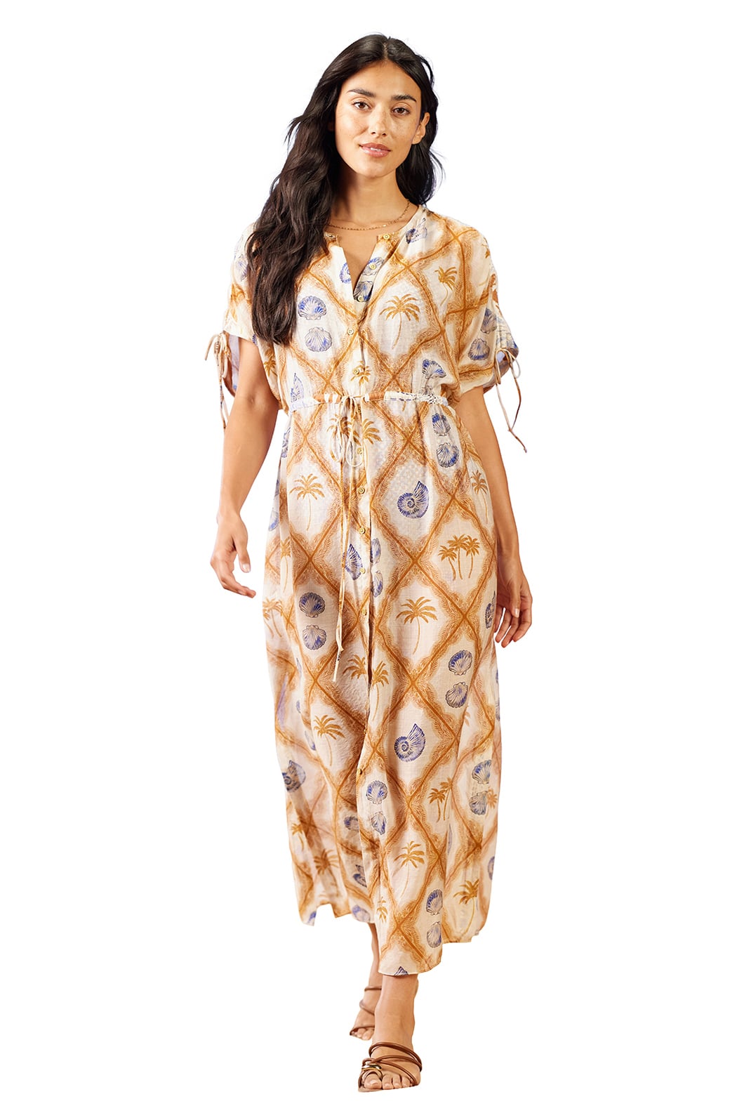 A breezy beach cover-up cut in a flowing maxi silhouette, the Flowy Wear 4-Ways Cover Up Dress can be styled multiple ways for sun and sand. This lightweight dress features short sleeves, a tie waist and an easy button front with an all-over tropical print. It pairs perfectly with sandals for casual vacation days and is offered by XIX PALMS as an effortless resort piece.